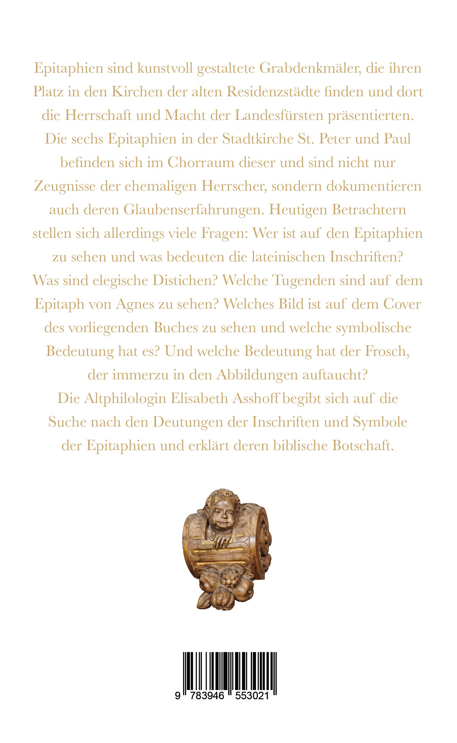 Epitaphien sind kunstvoll gestaltete Grabdenkmäler, die ihren Platz in den Kirchen der alten Residenzstädte finden und dort die Herrschaft und Macht der Landesfürsten präsentierten.Die sechs Epitaphien in der Stadtkirche St. Peter und Paul befinden sich im Chorraum dieser und sind nicht nur Zeugnisse der ehemaligen Herrscher, sondern dokumentieren auch deren Glaubenserfahrungen.Heutigen Betrachtern stellen sich allerdings viele Fragen: Wer ist auf denEpitaphien zu sehen und was bedeuten die lateinischen Inschriften? Was sindelegische Distichen? Welche Tugenden sind auf dem Epitaph von Agnes zusehen? Welches Bild ist auf dem Cover des vorliegenden Buches zusehen und welche symbolische Bedeutung hat es? Und welche Bedeutung hatder Frosch, der immerzu in den Abbildungen auftaucht?Die Altphilologin Elisabeth Asshoff begibt sich auf die Suche nach denDeutungen der Inschriften und Symbole der Epitaphien und erklärt derenbiblische Botschaft.