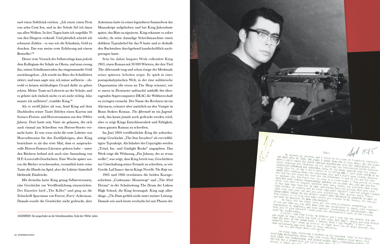 -Eine Fülle von Fotos und Dokumenten, seltene Erinnerungsstücke aus Stephen Kings persönlicher Sammlung, darunter private Korrespondenz, handgeschriebene Manuskriptseiten, Buchumschläge, Filmstills, ein unveröffentlichtes Gedicht sowie eine bisher nicht publizierte Kurzgeschichte.