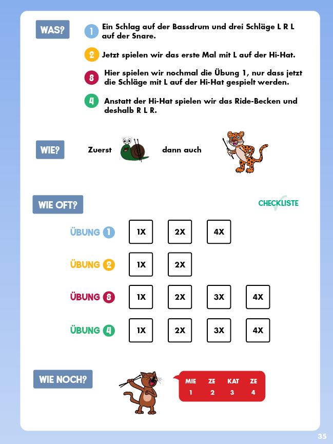 Dieses Schlagzeugbuch für Anfänger kommt ganz ohne Noten aus. Die von Andreas Schneid entwickelte Methode verwendet einfache Bilder und Symbole als Notenersatz, die Takte werden mithilfe eines Rastersystems dargestellt. Das ist auch für die Jüngsten einfach zu lesen und garantiert sehr schnelle Lernfortschritte.