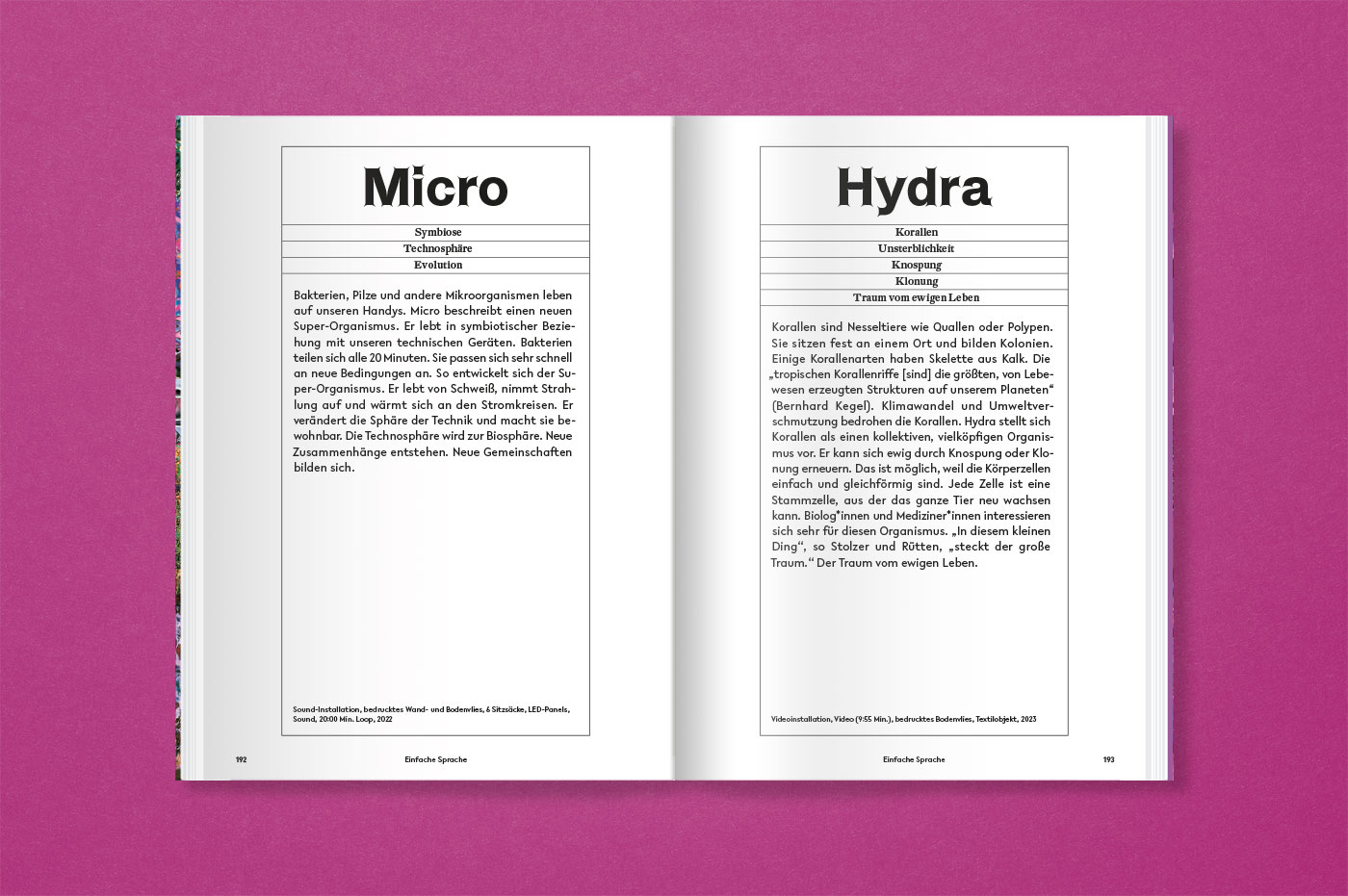 Die fiktiven Wesen, die den Besucher:innen in bunten, comichaften Video-, VR- und Soundinstallationen begegnen, wecken ob ihrer Winzigkeit und ihres kindlichen Gesangs auf subtile Weise die Beschützerinstinkte und Empathie der Betrachtenden. Die Publikation enthält neben einer Fotodokumentation der Ausstellung einen neuen Essay von Salome Rodeck sowie kurze enzyklopädische Texte bzw. Textauszüge zu den sieben Charakteren.