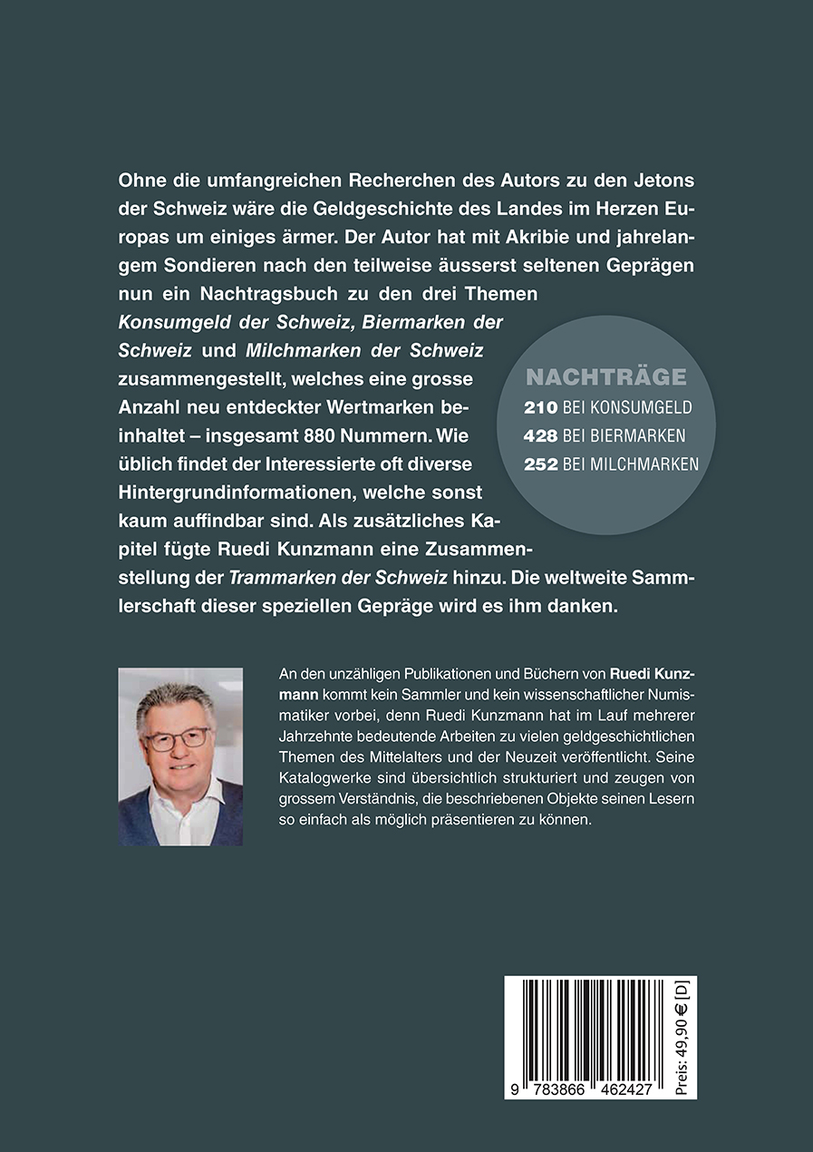 Ohne die umfangreichen Recherchen des Autors zu den Jetons der Schweiz wäre die Geldgeschichte des Landes im Herzen Europas um einiges ärmer. Der Autor hat mit Akribie und jahrelangem Sondieren nach den teilweise äusserst seltenen Geprägen nun ein Nachtragsbuch zu den drei Themen Konsumgeld der Schweiz, Biermarken der Schweiz und Milchmarken der Schweiz zusammengestellt, welches eine grosse Anzahl neu entdeckter Wertmarken beinhaltet - insgesamt 880 Nummern. Wie üblich findet der Interessierte oft diverse Hintergrundinformationen, welche sonst kaum auffindbar sind. Als zusätzliches Kapitel fügte Ruedi Kunzmann eine Zusammenstellung der Trammarken der Schweiz hinzu. Die weltweite Sammlerschaft dieser speziellen Gepräge wird es ihm danken.