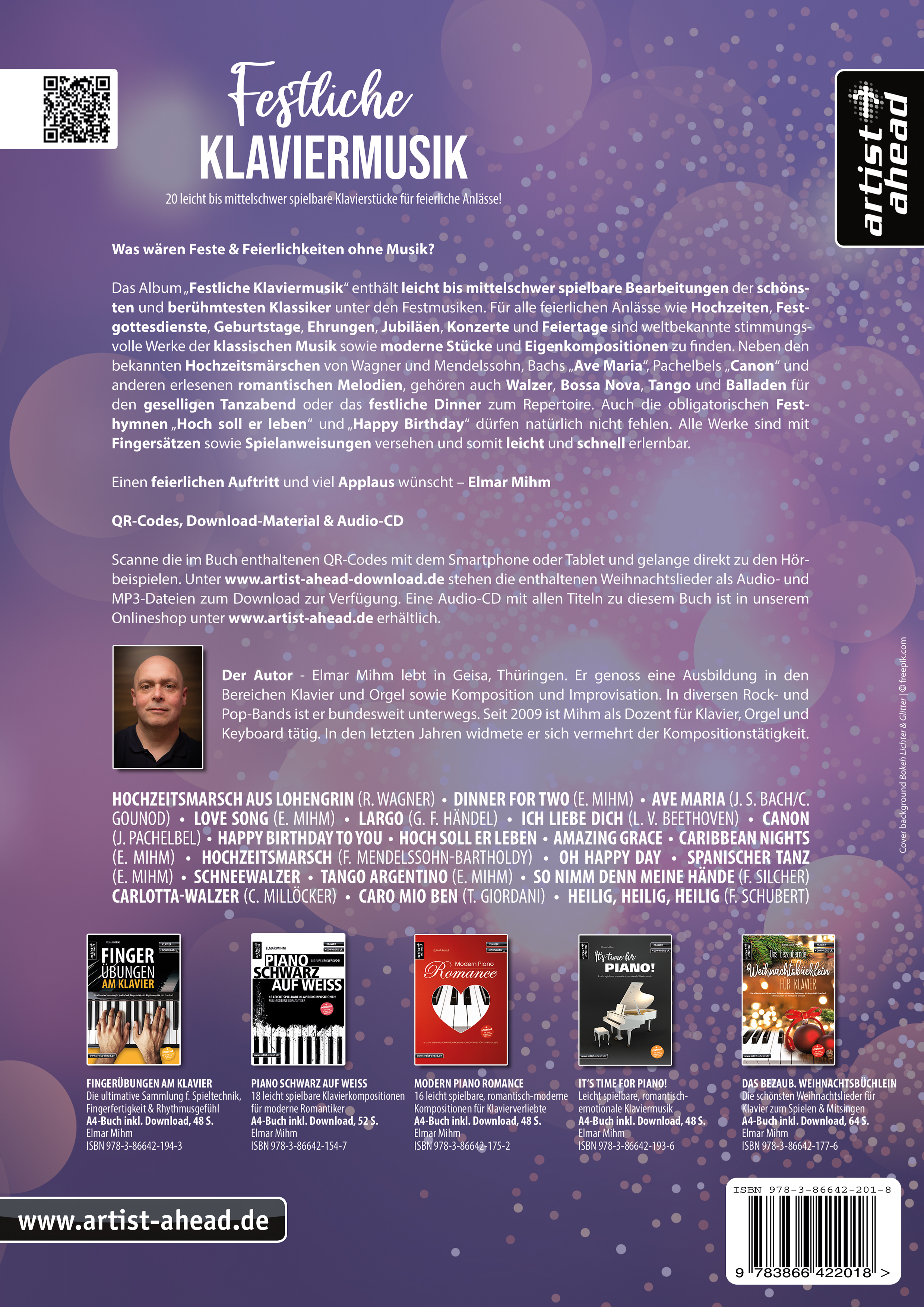 Das Album Festliche Klaviermusik enthält leicht bis mittelschwer spielbare Bearbeitungen der schönsten und berühmtesten Klassiker unter den Festmusiken. Für alle feierlichen Anlässe wie Hochzeiten, Festgottesdienste, Geburtstage, Ehrungen, Jubiläen, Konzerte und Feiertage sind weltbekannte stimmungsvolle Werke der klassischen Musik sowie moderne Stücke und Eigenkompositionen zu finden. Neben den bekannten Hochzeitsmärschen von Wagner und Mendelssohn, Bachs "Ave Maria", Pachelbels "Canon" und anderen erlesenen romantischen Melodien, gehören auch Walzer, Bossa Nova, Tango und Balladen für den geselligen Tanzabend oder das festliche Dinner zum Repertoire. Auch die obligatorischen Festhymnen "Hoch soll er leben" und "Happy Birthday" dürfen natürlich nicht fehlen. Alle Werke sind mit Fingersätzen sowie Spielanweisungen versehen und somit leicht und schnell erlernbar. Einen feierlichen Auftritt und viel Applaus wünscht - Elmar Mihm.