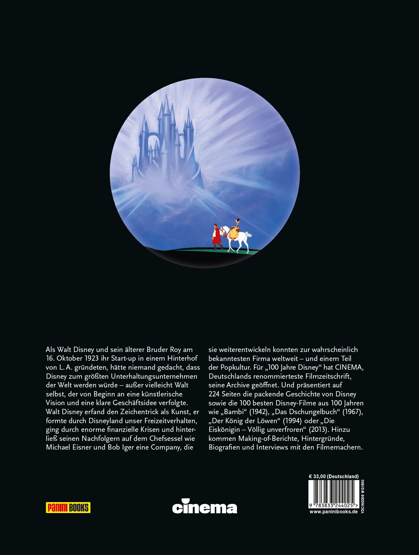 Seit genau 100 Jahren beflügeln die Werke des von Walt Disney gegründeten Studios die Fantasie des Publikums, begeistern kleine und große Zuschauer und prägen die Popkultur. Zum großen Disney-Jubiläum zeichnet CINEMA, Deutschlands bekanntestes Filmmagazin, mit vielen Hintergrundberichten, Interviews und Making-of-Reportagen den Weg Disneys vom Maus-Haus zum modernen Entertainment-Giganten nach. Das Buch schildert die Verwirklichung von Walt Disneys Visionen, die Arbeit an technologischen Meilensteinen sowie den Einfluss gesellschaftspolitischer Entwicklungen auf das Studio. Außerdem präsentiert CINEMA die 100 besten Filme von Disney und seiner angeschlossenen Studios: von berühmten Zeichentrickfilmen wie "Schneewittchen und die sieben Zwerge" über die wegweisenden Animations-Hits aus dem Hause Pixar ("Findet Nemo") bis hin zu Marvels Superheldenfilmen, Star Wars, Oscar-gekrönten Dramen und zahlreichen Geheimtipps.
