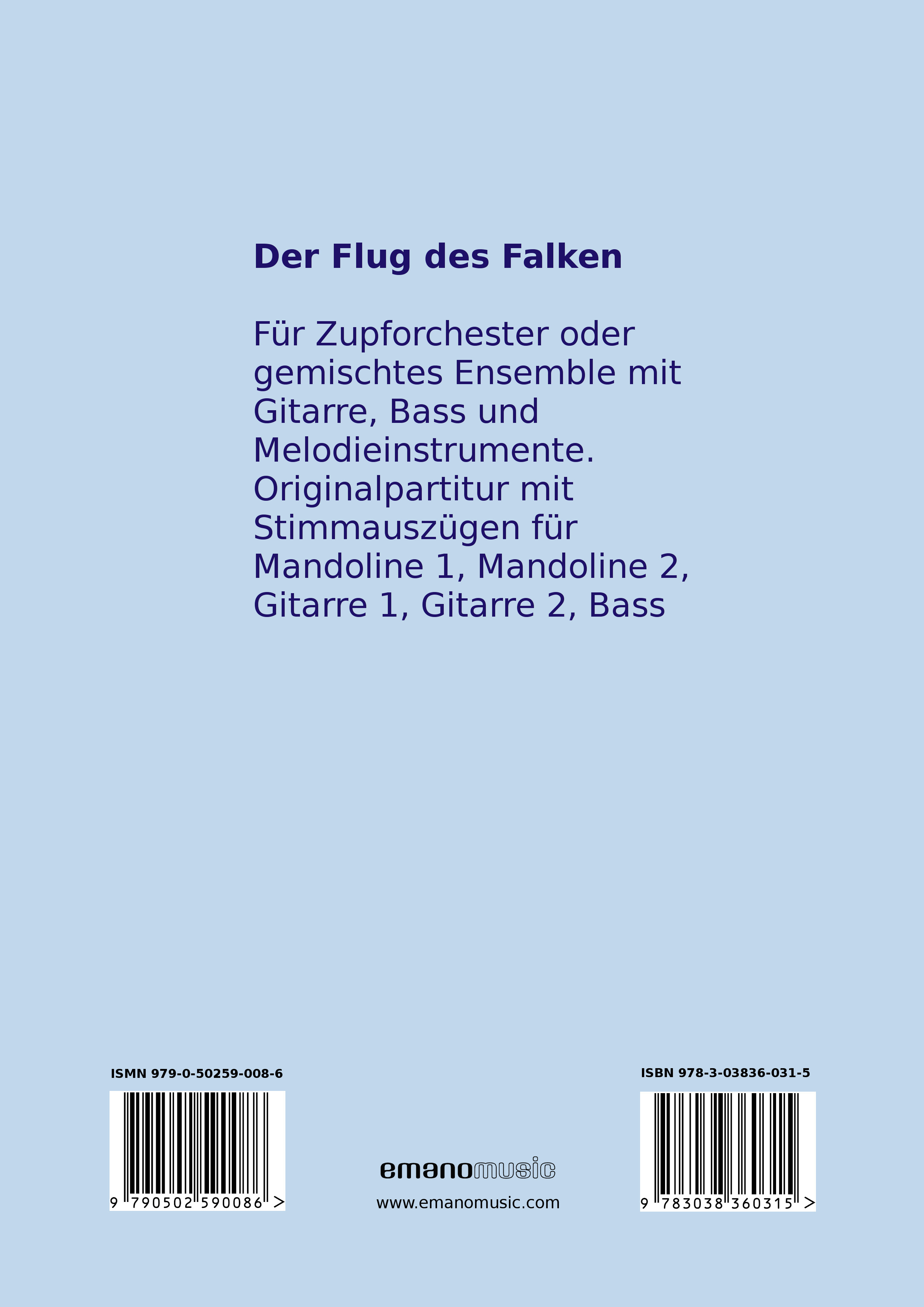 Der Flug des FalkenFür Zupforchester oder gemischtes Ensemble mit Gitarre, Bass und Melodieinstrumente.Originalpartitur mit Stimmauszügen für Mandoline 1, Mandoline 2, Gitarre 1, Gitarre 2, Bass