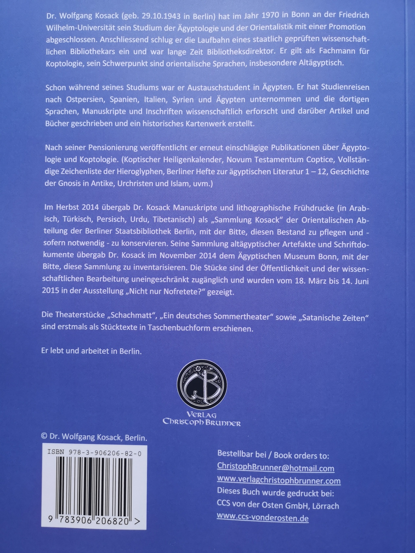 Dr. Wolfgang Kosack, Jahrgang 1943, promovierte im Jahr 1970 an der Universität Bonn in Ägyptologie und Orientalistik. Er hat langjährige Erfahrung als wissenschaftlicher Bibliothekar und Bibliotheksdirektor. Seine wissenschaftlichen Schwerpunkte sind Altägyptisch und Koptologie. Er hat Studienreisen nach Ostpersien, Spanien, Italien, Syrien und Ägypten unternommen, Manuskripte und Inschriften dort wissenschaftlich erforscht. Daraus ist u.a. ein Buch über die Alhambra und ein historisches Kartenwerk entstanden. Nach seiner Pensionierung richtete er sein Augenmerk auf die Fachgebiete: Hieroglyphische Zeichenliste, das koptisch-bohairische Neue Testament, die Edition koptischer Texte und medizinische sowie literarische Papyri des Alten Ägypten. Er hat zwei Grammatiken geschrieben. Eines seiner Hauptwerke ist die vollständige Übersetzung der Pyramidentexte des Alten Reiches und die Edition des Wörterbuchs der Ägyptischen Sprache, für das er mehr als 40 Jahre Belege gesammelt hat. In seinen Bearbeitungen hat er zahlreiche Anstöße und Anregungen für seine Fachkollegen und Fachstudenten gegeben. Seine Sammlungen hat er in Bonn, in der Staatsbibliothek zu Berlin und demnächst auch in der Humboldt-Universität Berlin der Öffentlichkeit zugänglich gemacht. Derzeit beschäftigt er sich mit der Ergänzung sowie der Erweiterung des Lexikon des Qurâns. Er lebt und arbeitet in Berlin.
