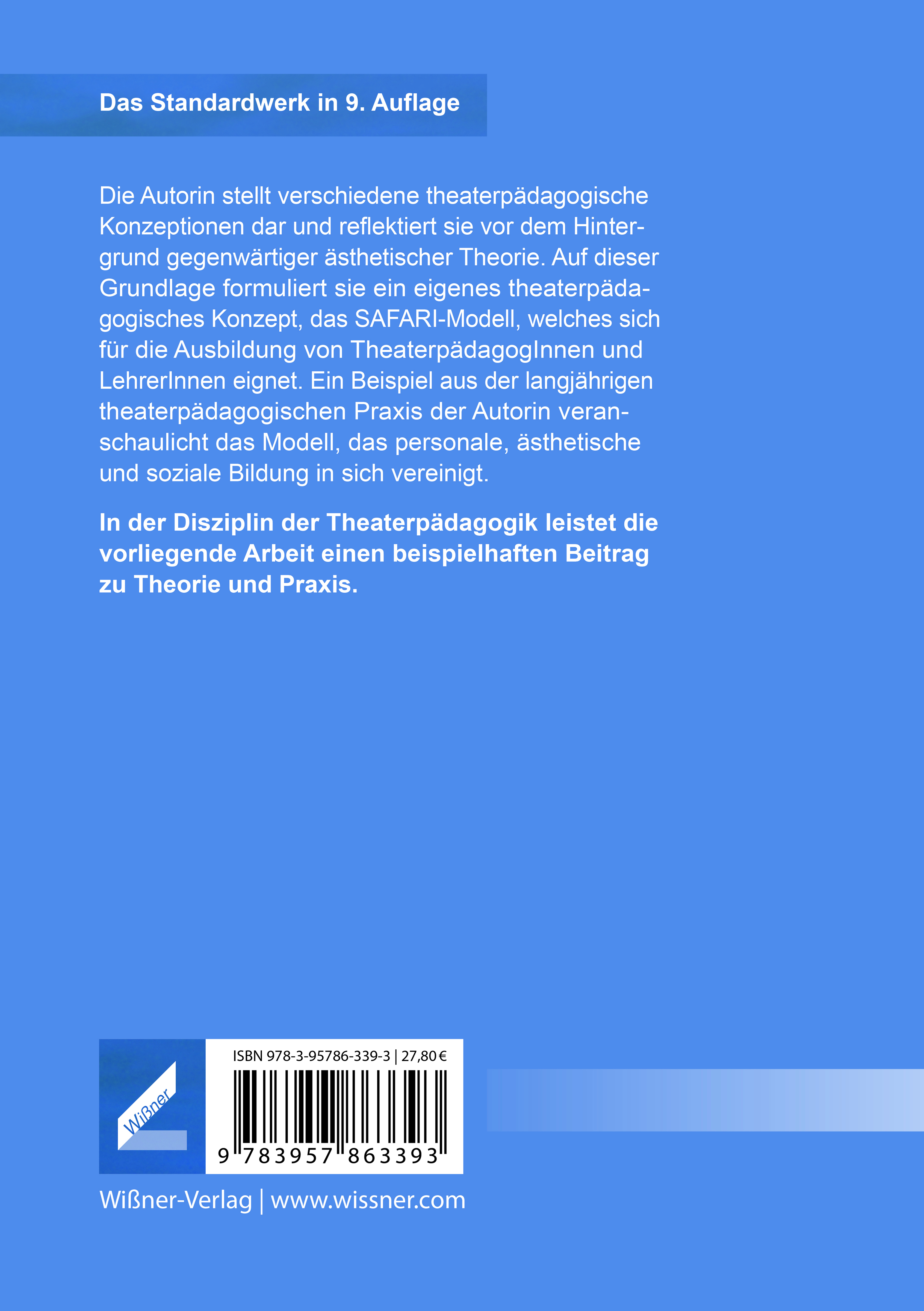 Das Standardwerk in 9. AuflageDie Autorin stellt verschiedene theaterpädagogische Konzeptionen dar und reflektiert sie vor dem Hintergrund gegenwärtiger ästhetischer Theorie. Auf dieser Grundlage formuliert sie ein eigenes theaterpädagogisches Konzept, das SAFARI-Modell, welches sich für die Ausbildung von TheaterpädagogInnen und LehrerInnen eignet. Ein Beispiel aus der langjährigen theaterpädagogischen Praxis der Autorin veranschaulicht das Modell, das personale, ästhetische und soziale Bildung in sich vereinigt.In der Disziplin der Theaterpädagogik leistet die vorliegende Arbeit einen beispielhaften Beitrag zu Theorie und Praxis.