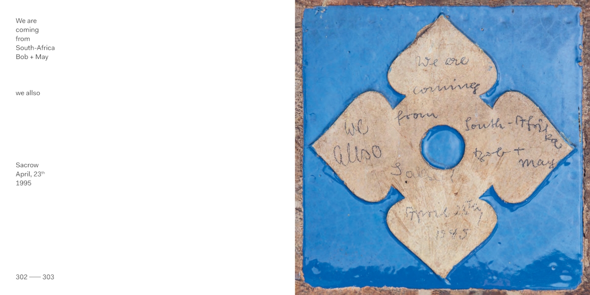 Auf den blau glasierten Fliesen in Blütenform der von Ludwig Persius 1844 erbauten Sacrower Heilandskirche finden sich 150 Jahre deutsche Geschichte kondensiert in kurzen Nachrichten. Verfasst in Deutsch, Englisch oder Russisch, notiert in Sütterlin oder lateinischer Schrift, reichen sie von alltäglichen Kritzeleien bis zu historischen Wegmarken aus der Zeit des Zweiten Weltkriegs oder des geteilten Deutschlands.