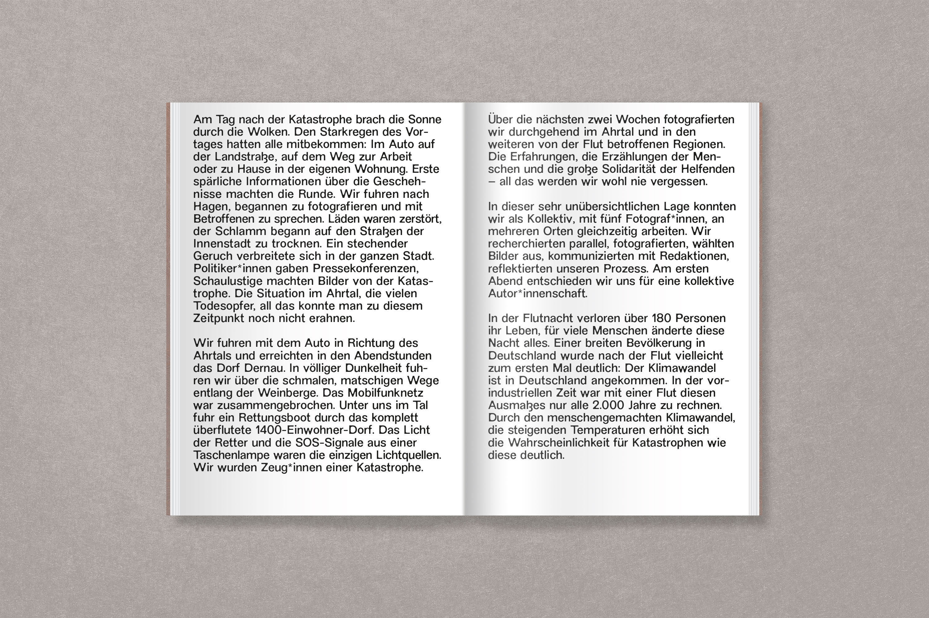 Schnell war klar, dass der Aufbau der zerstörten Gebiete einen langen Atem brauchen würde. Als das mediale Interesse wieder abnahm, beschloss das Kollektiv, die Region, die zahlreichen Helfenden, Feuerwehrleute und Betroffenen weiterhin zu besuchen. Ein Jahr lang wurden die Mitglieder Zeugen von Verlust und immenser Trauer, aber auch von beeindruckender Solidarität, Hilfsbereitschaft und Ausdauer. More than 180 people lost their lives in the flood of July 14–15, 2021. For numerous people, that night changed everything. In the aftermath of the flood, the general public became aware, perhaps for the first time, that climate change has arrived in Germany.
