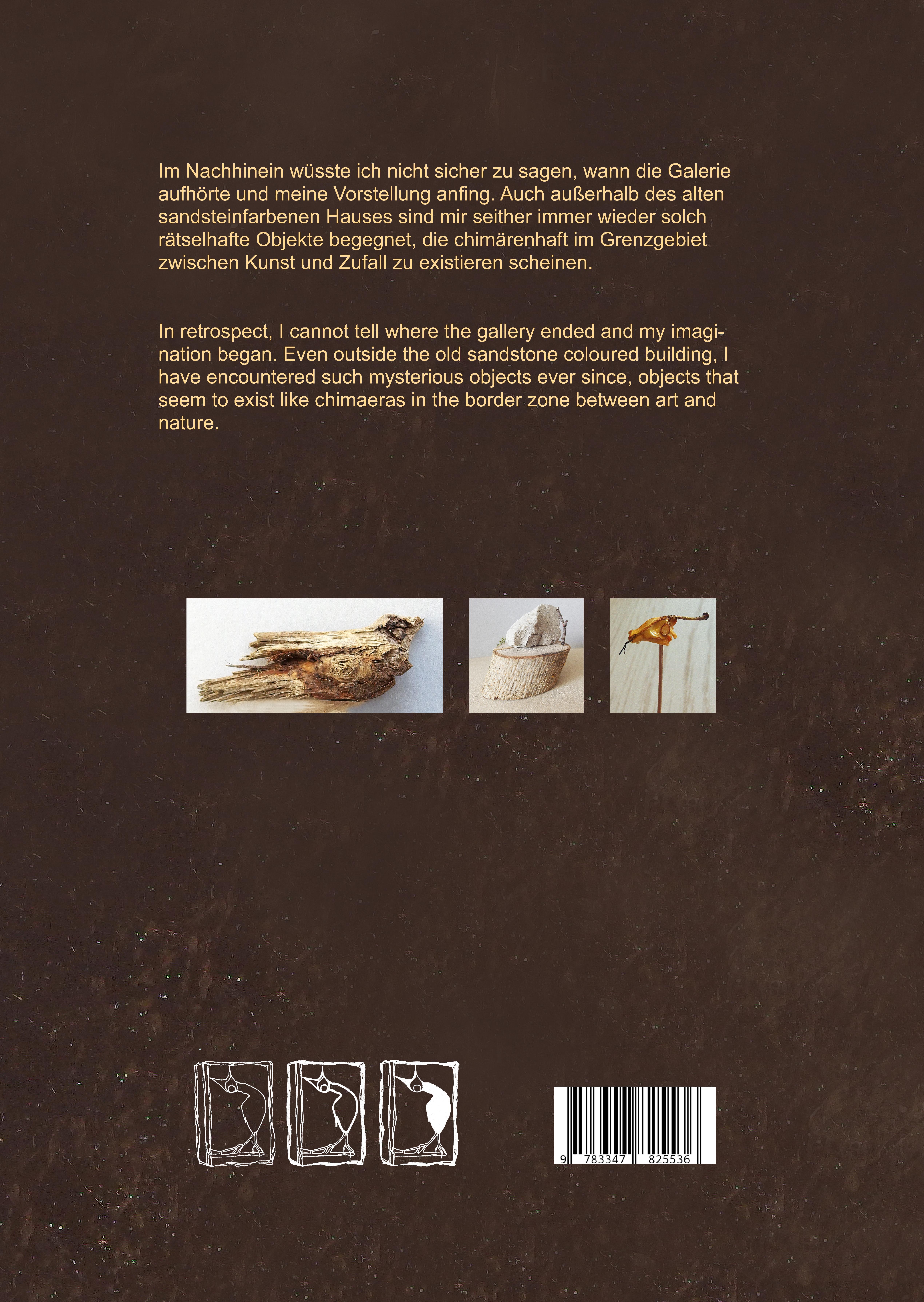 Im Nachhinein wüsste ich nicht sicher zu sagen, wann die Galerie aufhörte und meine Vorstellung anfing. Auch außerhalb des alten sandsteinfarbenen Hauses sind mir seither immer wieder solch rätselhafte Objekte begegnet, die chimärenhaft im Grenzgebiet zwischen Kunst und Zufall zu existieren scheinen. *** In retrospect, I cannot tell where the gallery ended and my imagination began. Even outside the old sandstone coloured building, I have encountered such mysterious objects ever since, objects that seem to exist like chimaeras in the border zone between art and nature.
