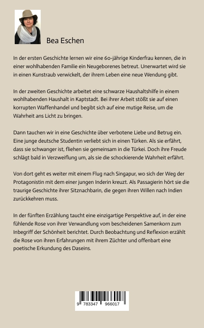 In der Sammlung von fünf Kurzgeschichten entfaltet sich das komplexe Leben faszinierender Charaktere in verschiedenen spannenden Erzählungen.In der ersten Geschichte lernen wir eine 60-jährige Kinderfrau kennen, die in einer wohlhabenden Familie ein Neugeborenes betreut. Unerwartet wird sie in einen Kunstraub verwickelt, der ihrem Leben eine neue Wendung gibt.In der zweiten Geschichte lernen wir eine schwarze Haushaltshilfe kennen, die in Südafrika in einem wohlhabenden Haushalt arbeitet. Bei ihrer Arbeit stößt sie auf einen korrupten Waffenhandel und begibt sich auf eine mutige Reise, um die Wahrheit ans Licht zu bringen.Dann tauchen wir in eine Geschichte über verbotene Liebe und Betrug ein. Eine junge deutsche Studentin verliebt sich in einen Türken. Als sie erfährt, dass sie schwanger ist, fliehen sie gemeinsam in die Türkei. Doch ihre Freude schlägt bald in Verzweiflung um, als sie die schockierende Wahrheit erfährt.Von dort geht es weiter mit einem Flug nach Singapur, wo sich der Weg der Protagonistin mit dem einer jungen Inderin kreuzt. Als Passagierin hört sie die traurige Geschichte ihrer Sitznachbarin, die gegen ihren Willen nach Indien zurückkehren muss.Inmitten dieser fesselnden Geschichten taucht in der fünften Erzählung eine einzigartige Perspektive auf, in der eine fühlende Rose von ihrer Verwandlung vom bescheidenen Samenkorn zum Inbegriff der Schönheit berichtet. Durch Beobachtung und Reflexion erzählt die Rose von ihren Erfahrungen mit ihrem Züchter und offenbart eine poetische Erkundung des Daseins.