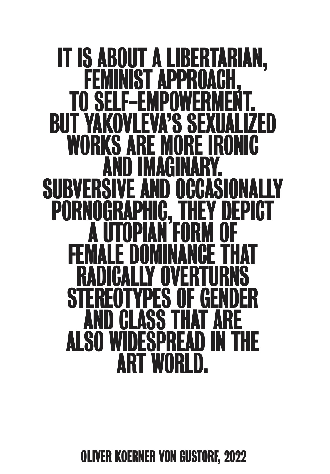 Sonja Yakovleva (geb. 1989 in Potsdam, lebt und arbeitet in Frankfurt am Main) verwendet pornografische Darstellungen und Bilder aus dem Internet als Vorlagen für ihre teils großformatigen Papierschnitte, in denen persönliche und öffentliche Geschichten von Frauen, Machtverhältnissen, Sexualität und Gewalt verhandelt werden. Die Scherenschnitte zeigen volkstümlichen Motive, mit denen von der Kolonialzeit über die Moderne bis ins angehende 21. Jahrhundert Märchen, Mythen und Ideologien in das kollektive Bewusstsein eingeschrieben wurden. Yakovleva, deren Arbeit häufig mit einem sex-positiven Feminismus in Verbindung gebracht wird, eignet sich diese folkloristische Bildsprache an und hybridisiert und sexualisiert sie. So lässt sie beispielsweise Dessous und Strap-on-Dildos als Schmetterlings- und Insektenpräparate erscheinen, was an historische Forschungsreisen denken lässt. Thematisiert wird aber auch der kapitalistische Zwang, jeden Fetisch zu kategorisieren, zu bewerten und zu vermarkten.