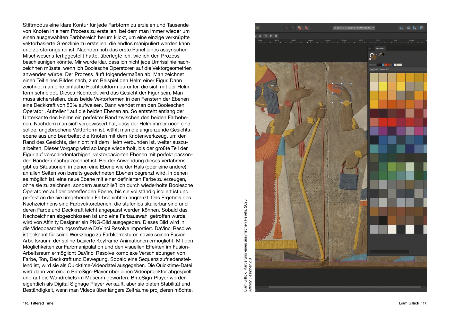 Der Bildhauer und Objektkünstler Liam Gillick hat für die historischen Räume des Pergamonmuseums eine Intervention mit dem Titel Filtered Time geschaffen. Mit Licht- und Farbprojektionen sowie Klangbildern vermittelt er 6.000 Jahre Kulturgeschichte als immersive Raumerfahrung. Gillick lässt die ikonische Prozessionsstraße und das Ischtar-Tor Babylons, die monumentalen Skulpturen von Tell Halaf und andere Exponate in einen Dialog treten und erzeugt so über alle historischen Perioden hinweg neue Bedeutungsebenen. Das erste gemeinsame Projekt des Berliner Vorderasiatischen Museums und des Hamburger Bahnhof - Nationalgalerie der Gegenwart präsentiert damit ein einzigartiges visuelles und sensorisches Erlebnis. Die vom Künstler selbst gestaltete Publikation gibt nicht nur die farbgewaltige Inszenierung wieder, sondern auch einen Einblick in die wechselvolle Historie des fast hundert Jahre alten Museums.