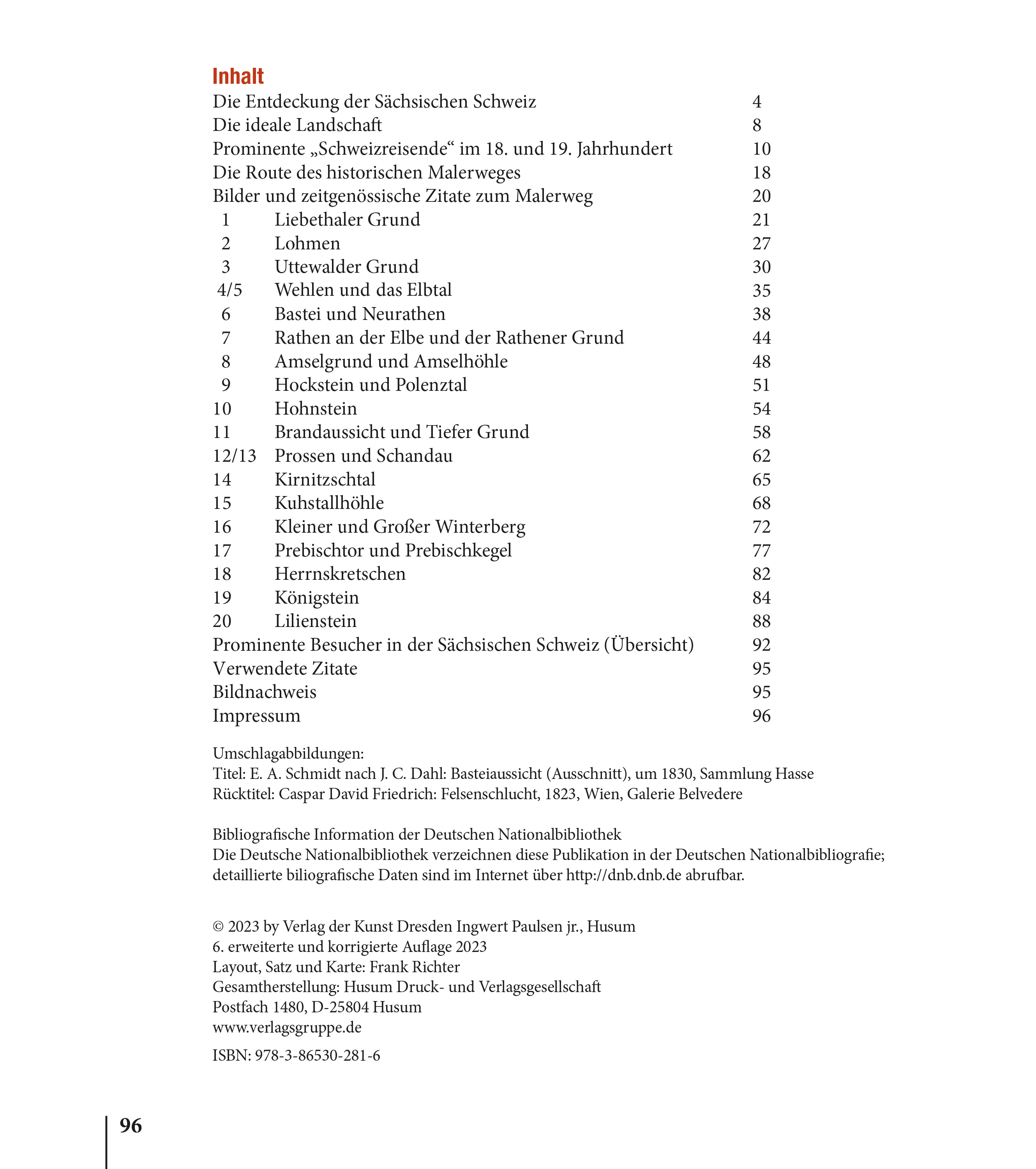 Frank Richter hat Kunstwerke, die am und um den Malerweg entstanden, zusammengestellt. Ausgehend von der Entdeckung des Elbsandsteingebirges als "ideale Landschaft" stellt das Buch die prominenten Schweizreisenden des 18. und 19. Jahrhunderts vor und schildert die Entstehung des "Malerwegs". Den einzelnen Stationen des historischen Weges ordnet er die Bilder der Künstler sowie zeitgenössische Zitate zu. Das Buch eröffnet so die Möglichkeit, die "!deale Landschaft" Sächsische Schweiz im Sinne der Frühromantik heute ganz neu zu erleben. Besucht man die berühmten Punkte und vergleicht sie mit den künstlerischen Darstellungen, so ergibt sich eine faszinierende Sicht auf das Elbsandsteingebirge im Vergleich des Gestern und Heute, des Blicks des Künstlers mit der eigenen Sichtweise.