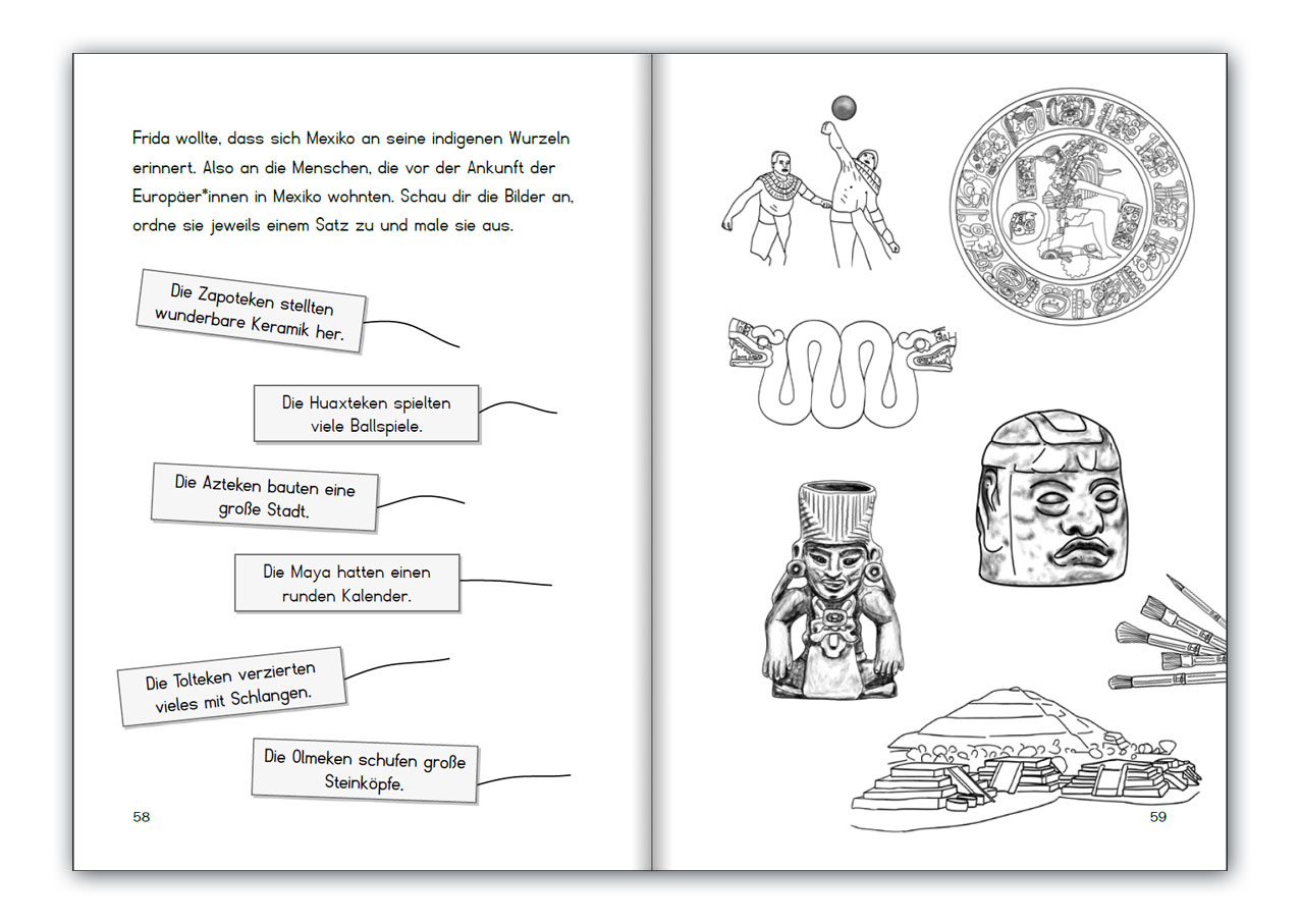 Eine Malerin im Blumenmeer war diese Frau, die sich nicht unterkriegen ließ: Frida Kahlo (1907-1954).Sie lebte für ihren Traum: die Malerei. Und brachte vielen jungen Menschen bei, die Welt mit Künstleraugen zu sehen. Frida gab Tieren, Pflanzen und Menschen einen Platz in der Kunst.Vor allem erfand sie das Selfie, als es noch gar nicht so hieß.* Was ist Fridas berühmtes Blaues Haus?* Wie kann Frida malen, als sie nur im Bett liegen darf?* Wo verstecken sich Affen, Papageien und Hirsche in Fridas Bildern?In diesem spannenden Buch findet ihr die Antworten, auch auf viele weitere Fragen. In leicht lesbarer Druckschrift. Als Schullektüre und für die Schulbibliothek geeignet. Mit Kreativ-Seiten zur eigenen Gestaltung.***Inhalt***Das Blaue Haus ... 6Eine glückliche Kindheit ... 8Eine echte Mexikanerin ... 10Ein schrecklicher Unfall ... 12Das neue Leben ... 14Herzensangelegenheiten ... 16Die USA - anders als gedacht? ... 18Tröstende Bilder ... 20Ich bin Künstlerin ... 22Die Welt ist schwarz ... 24Niemand malt wie Frida ... 26Von Frauen, Blumen und Tieren ... 28Frida als Lehrerin ... 30Das wahre Mexiko ... 32Allen Widrigkeiten zum Trotz ... 34Für ein starkes Mexiko ... 36Eine Frau, die fehlt ... 38Fridas Vermächtnis ... 40Solange wir uns erinnern ... 42Aus dem Schatten ... 44Hättest du's gewusst? ... 46Mach es zu deinem Buch! ... 51Pozole - ein mexikanisches Nationalgericht ... 62Noch nicht genug? ... 66Drei starke Frauen hinter diesem Buch ... 68Für kleine Leute mit großen Ideen.Band 6 der Reihe www.StarkeFrauen-Buch.deEin Titel vom Verlag www.editionriedenburg.at