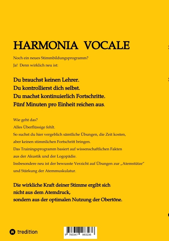 Stimmbildung ist in der Gesangsausbildung zum Sologesang und in den Einsingpraktiken der Chöre meist sehr zeitraubend und uneffektiv. Der Sänger bleibt unselbständig und abhängig vom Geangslehrer bzw. Chorleiter. Der Lernerfolg hängt von vielen Zufällen ab. Diese neue Anleitung zur Stimmbildung "Harmonia Vocale " entwickelt die für eine tragfähige Stimme notwendigen Obertöne. Der Sänger wird sensibilisiert, diese wichtigen Obertöne zu hören oder zu spüren. Er ist damit in der Lage, die Entwicklung seiner Stimme ohne einen Lehrer selbst zu gezielt voranzutreiben. Die Stimme wird so ganz unabhängig vom musikalischen Stil sehr schnell flexibel für den gewünschten Einsatz vorbereiet.