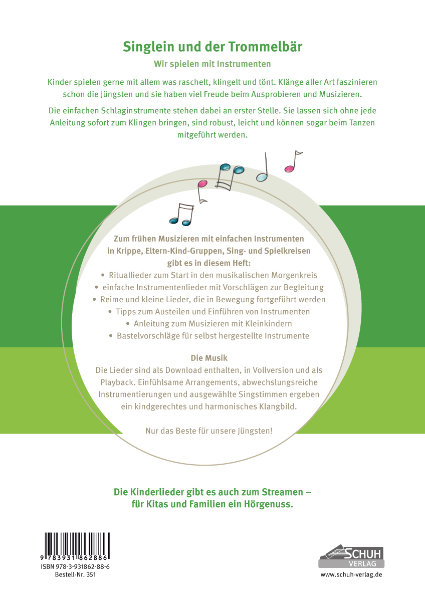 Kinder spielen gerne mit allem was raschelt, klingelt und tönt. Klänge aller Art faszinieren schon die Jüngsten und sie haben viel Freude beim Ausprobieren und Musizieren. Die einfachen Schlaginstrumente stehen dabei an erster Stelle. Sie lassen sich ohne jede Anleitung sofort zum Klingen bringen, sind robust, leicht und können sogar beim Tanzen mitgeführt werden.Zum frühen Musizieren mit einfachen Instrumenten in Krippe, Eltern-Kind-Gruppen, Sing- und Spielkreisen gibt es in diesem Heft:- Rituallieder zum Start in den musikalischen Morgenkreis- einfache Instrumentenlieder mit Vorschlägen zur Begleitung- Reime und kleine Lieder, die in Bewegung fortgeführt werden - Tipps zum Austeilen und Einführen von Instrumenten - Anleitung zum Musizieren mit Kleinkindern- Bastelvorschläge für selbst hergestellte InstrumenteDie Musik:Die Lieder sind als Download enthalten, in Vollversion und als Playback. Einfühlsame Arrangements, abwechslungsreiche Instrumentierungen und ausgewählte Singstimmen ergeben ein kindgerechtes und harmonisches Klangbild.Nur das Beste für unsere Jüngsten!