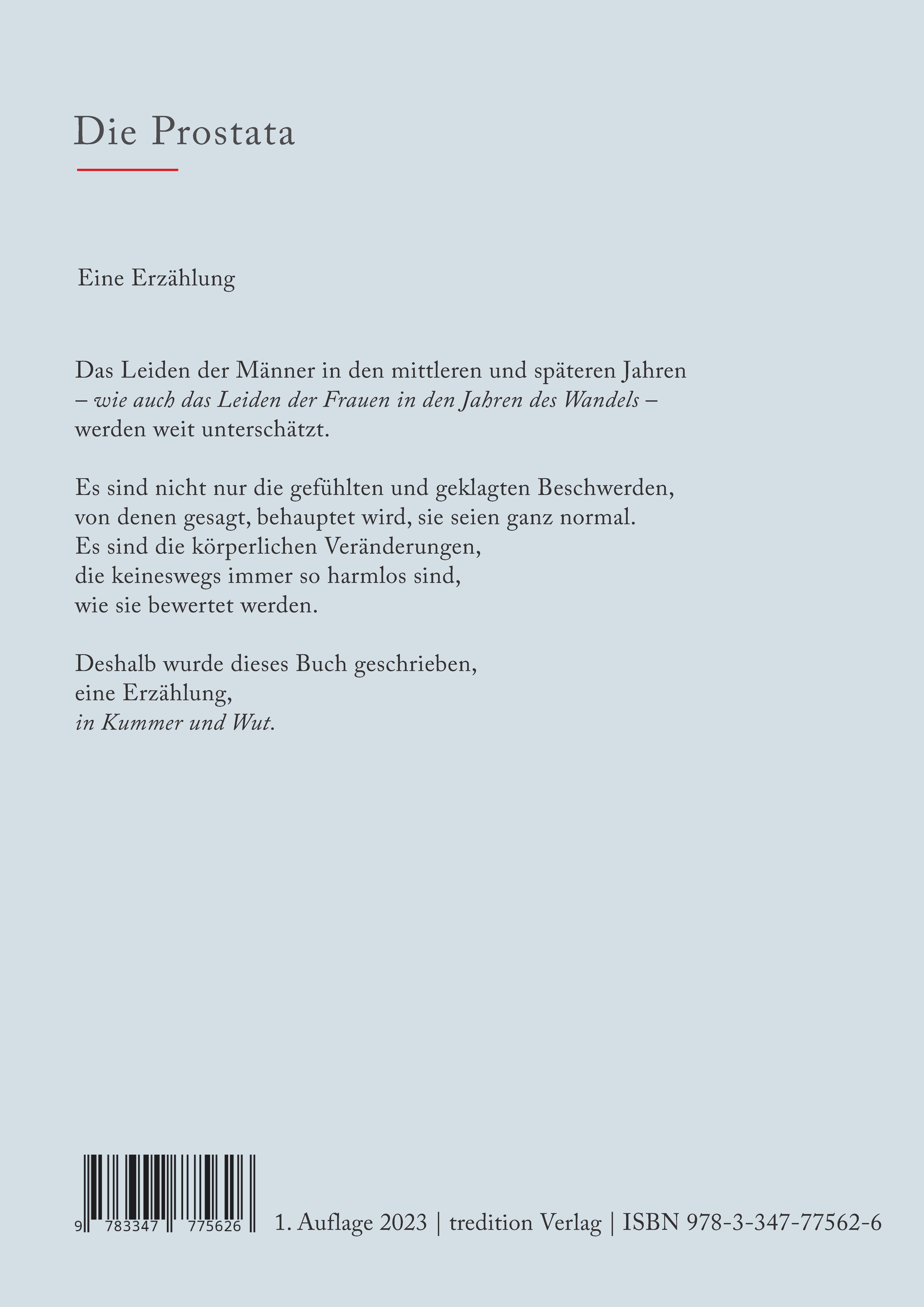 Ein Buch für Frauen und Männer, in den mittleren bis höheren Lebensjahren, für die die Prostata des Mannes plötzlich und unerwartet ein wichtiges körperliches Thema sein wird. Hier wird erzählt, ohne Rücksicht auf die kleinen und großen Tabus des Mannes und auch der Frau, was auf den Mann und die Frau zukommen kann, wenn die Prostata sich mit den Jahren, mit dem Körper, verändert.Es wird subjektiv wie objektiv, aus weiblicher und männlicher Perspektive, geschildert, berichtet, was es mit der Prostata auf sich hat, welche körperlichen, psychischen und sozialen Folgen eine mit dem Alter, im Alter, veränderte Prostata bewirken kann. Es werden die aktuellen medizinischen, psychotherapeutischen und sozialen Massnahmen erörtert, die dem Prostata-Mann und seiner Frau helfen sollen. Und es werden die therapeutischen Tabus erörtert, die uns bisher daran hinderten, eine systemische Sicht auf den körperlichen, psychischen und sozialen Wandel, von Männern und Frauen, in den mittleren und höheren Jahren zu wagen.