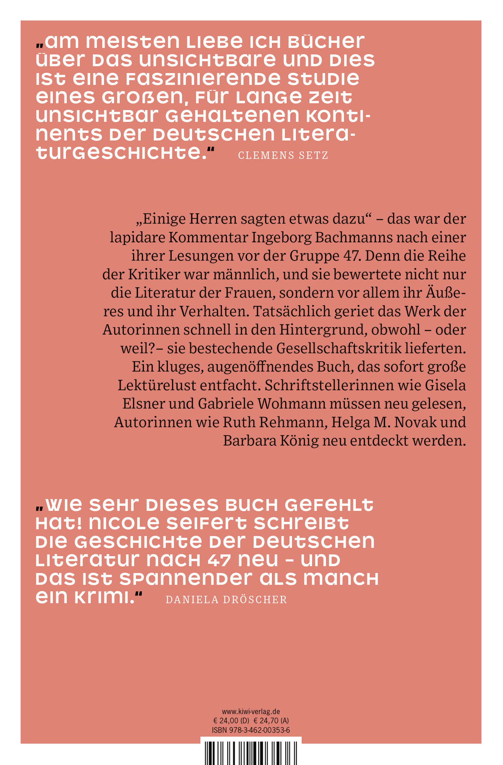 Ein kluges, augenöffnendes Buch, das sofort große Lektürelust entfacht. Schriftstellerinnen wie Gisela Elsner und Gabriele Wohmann müssen neu gelesen, Schriftstellerinnen wie Ruth Rehmann, Helga M. Novak und Barbara König neu entdeckt werden. Ein ganz neuer Blick auf die Gruppe 47 und die Nachkriegsliteratur, der uns bis in die Gegenwart führt.