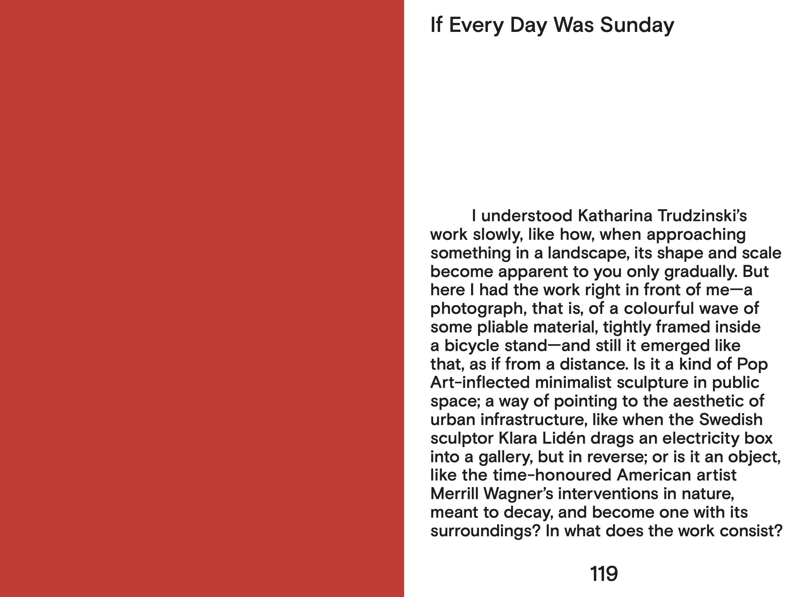 The publication November Walk unveils a series of ephemeral sculptures in public space. The artist invites us on a journey through urban landscapes, encouraging to reassess and rediscover these spaces through her playful and poetic interventions. With an essay by art critic and writer Kristian Vistrup Madsen.