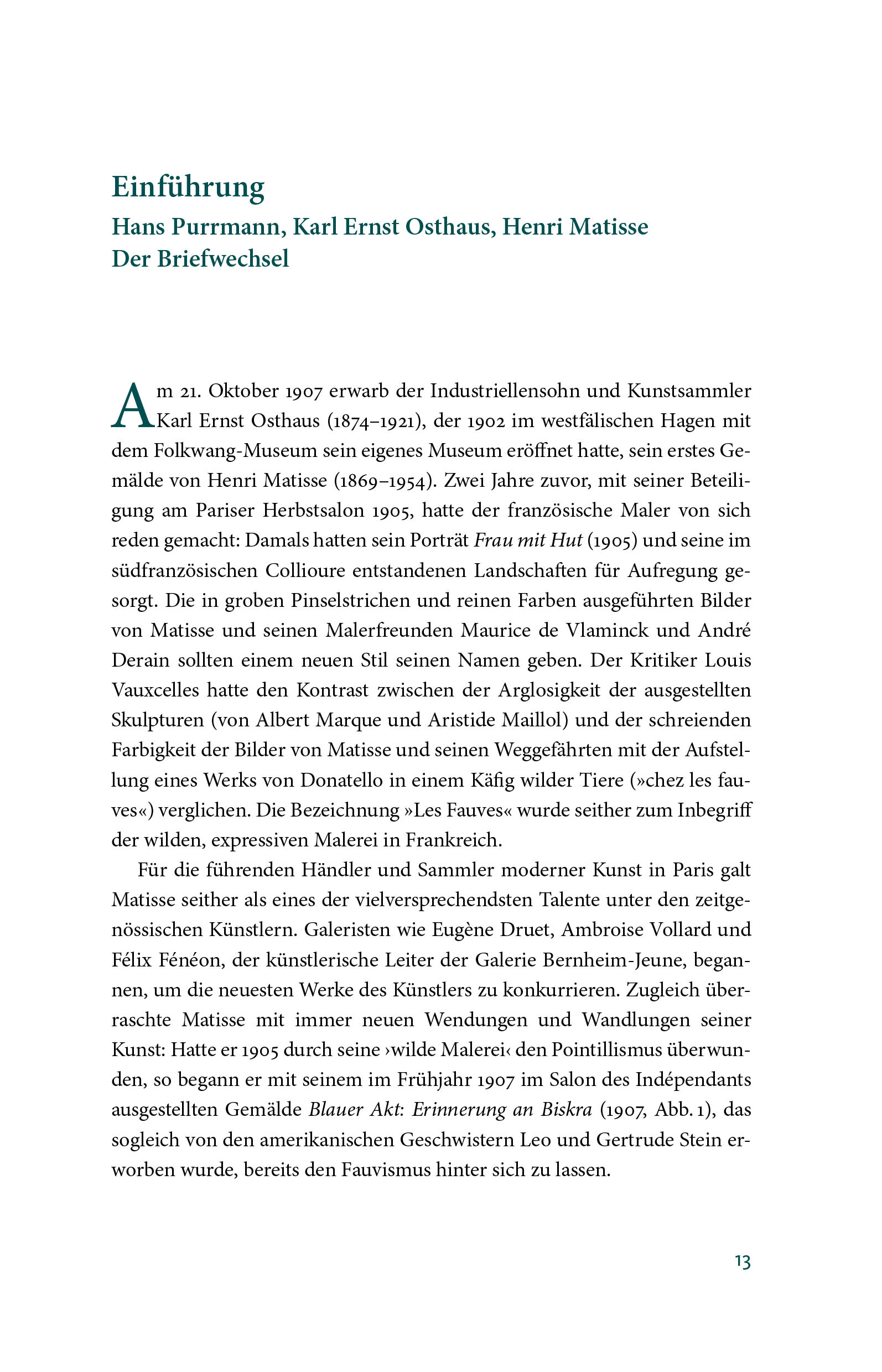 Die Edition macht erstmals den vollständigen Briefwechsel zwischen dem Sammler und Gründer des Folkwang-Museums Karl Ernst Osthaus mit den Malern Henri Matisse und Hans Purrmann zugänglich. Die Korrespondenz erschließt damit neue Quellen zur frühen Rezeptionsgeschichte der Werke von Matisse in Deutschland, zur Entstehungsgeschichte früher Hauptwerke des Malers und zur Gründung der Académie Matisse. Die Edition des weitverstreuten Briefwechsels bietet nicht nur für die Matisse-Forschung, sondern auch für die Beschäftigung mit Hans Purrmann und dem Gründer des Folkwang-Museums zahlreiche neue Erkenntnisse. Der Briefwechsel wird um ein Grußwort des Hans Purrmann Archivs sowie eine sachkundige Einführung der Herausgeber, ein Personenregister sowie ein Literaturverzeichnis ergänzt. Die wissenschaftlich fundierte Aufarbeitung des Briefwechsels bietet vielfältige neue Erkenntnisse zu Matisse, Osthaus und Purrmann Zahlreiche bislang unveröffentlichte Briefe Der Band setzt die faszinierende „Edition Purrmann Briefe“ des Hans Purrmann Archivs fort Blick ins Buch