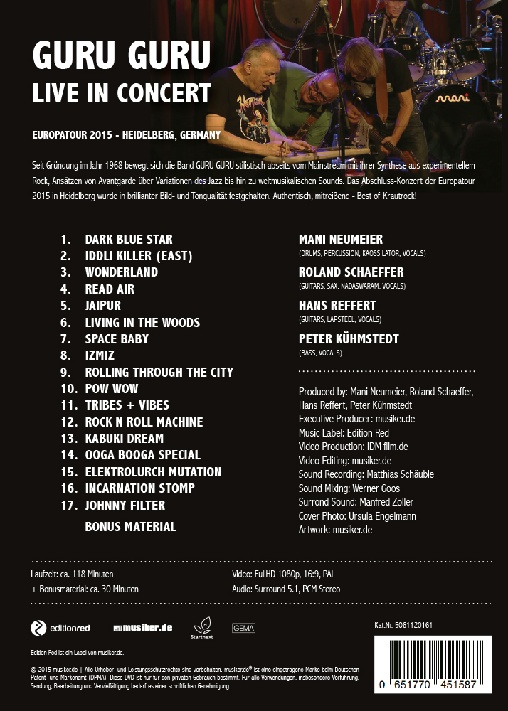 | Schlagworte | 68 • Concert • DVD • Guru Guru • Hans Reffert • Heidelberg • Karlstorbahnhof • Konzert • Konzertmitschnitt • Krautrock • Live • Mani • Mani Neumeier • Neumeier • Peter Kühmstedt • Roland Schaeffer |