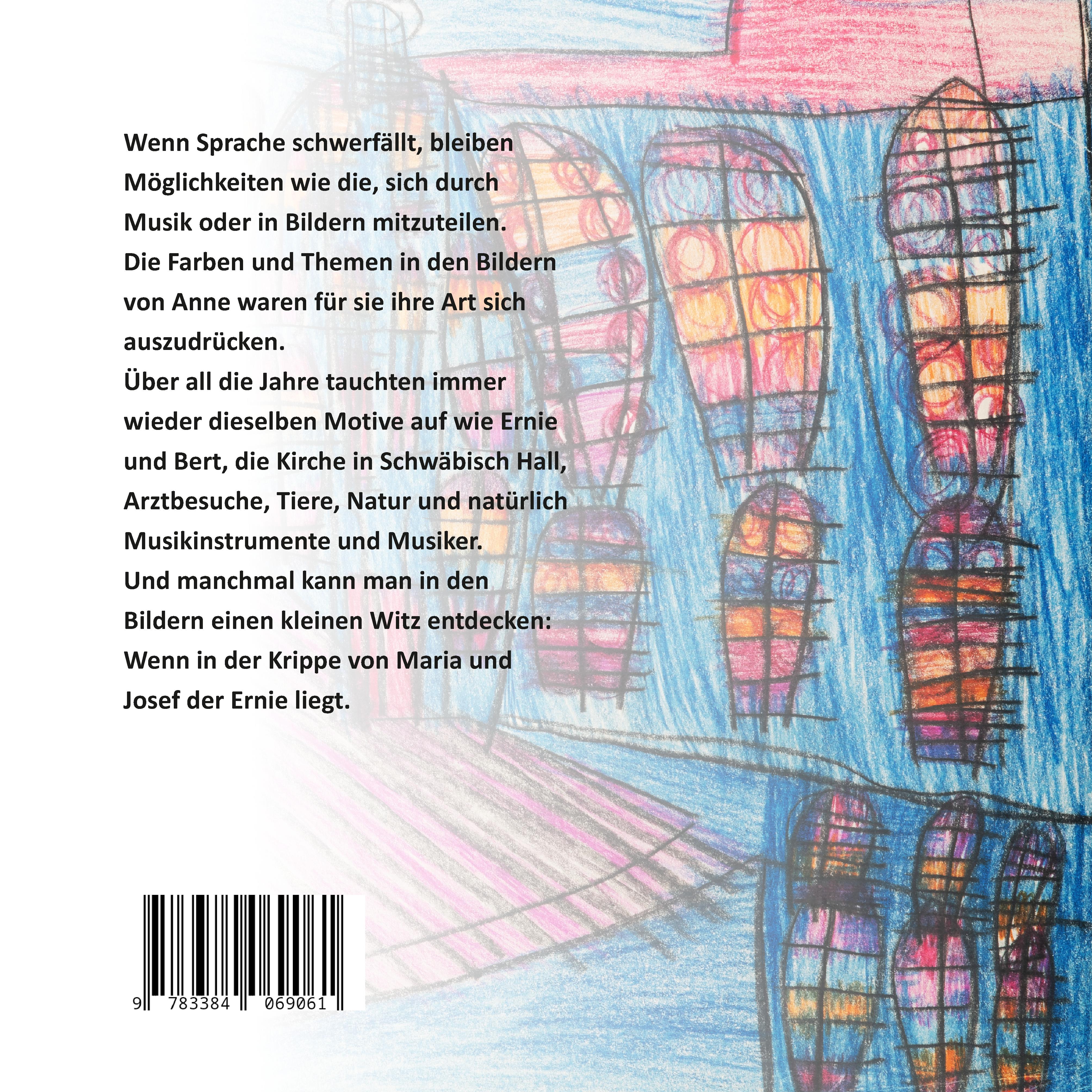 Wenn Sprache schwerfällt, bleiben Möglichkeiten wie die, sich durch Musik oder in Bildern mitzuteilen.Die Farben und Themen in den Bildern von Anne waren für sie ihre Art sich auszudrücken. Über all die Jahre tauchten immer wieder dieselben Motive auf wie Ernie und Bert, die Kirche in Schwäbisch Hall, Arztbesuche, Tiere, Natur und natürlich Musikinstrumente und Musiker.Und manchmal kann man in den Bildern einen kleinen Witz entdecken: Wenn in der Krippe von Maria und Josef der Ernie liegt.