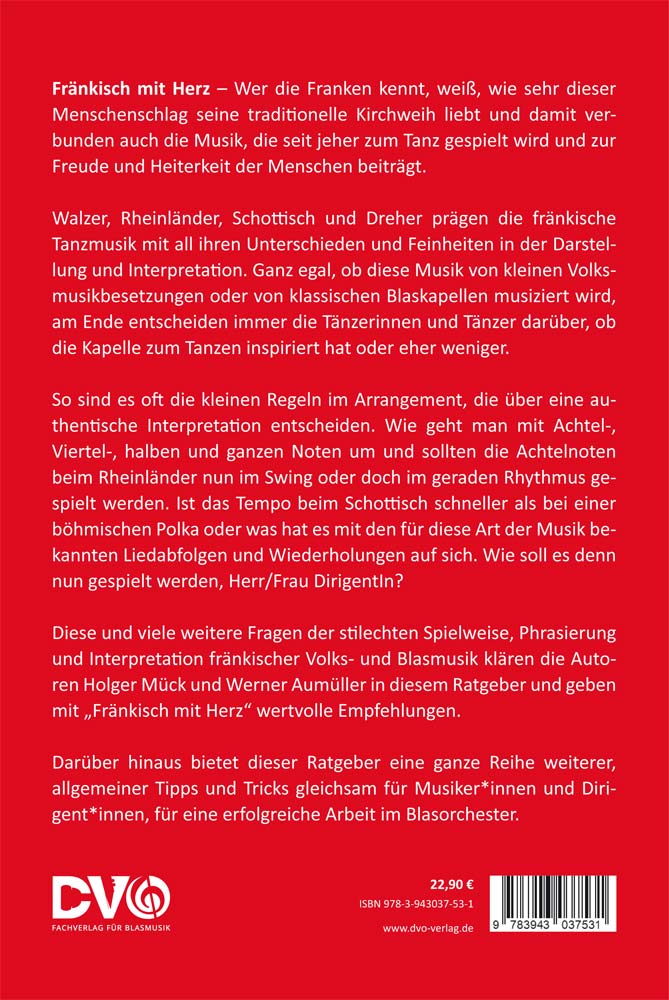 Diese und viele weitere Fragen der stilechten Spielweise, Phrasierung und Interpretation fränkischer Volks- und Blasmusik klären die Autoren Holger Mück und Werner Aumüller in diesem Ratgeber und geben mit „Fränkisch mit Herz“ wertvolle Empfehlungen.