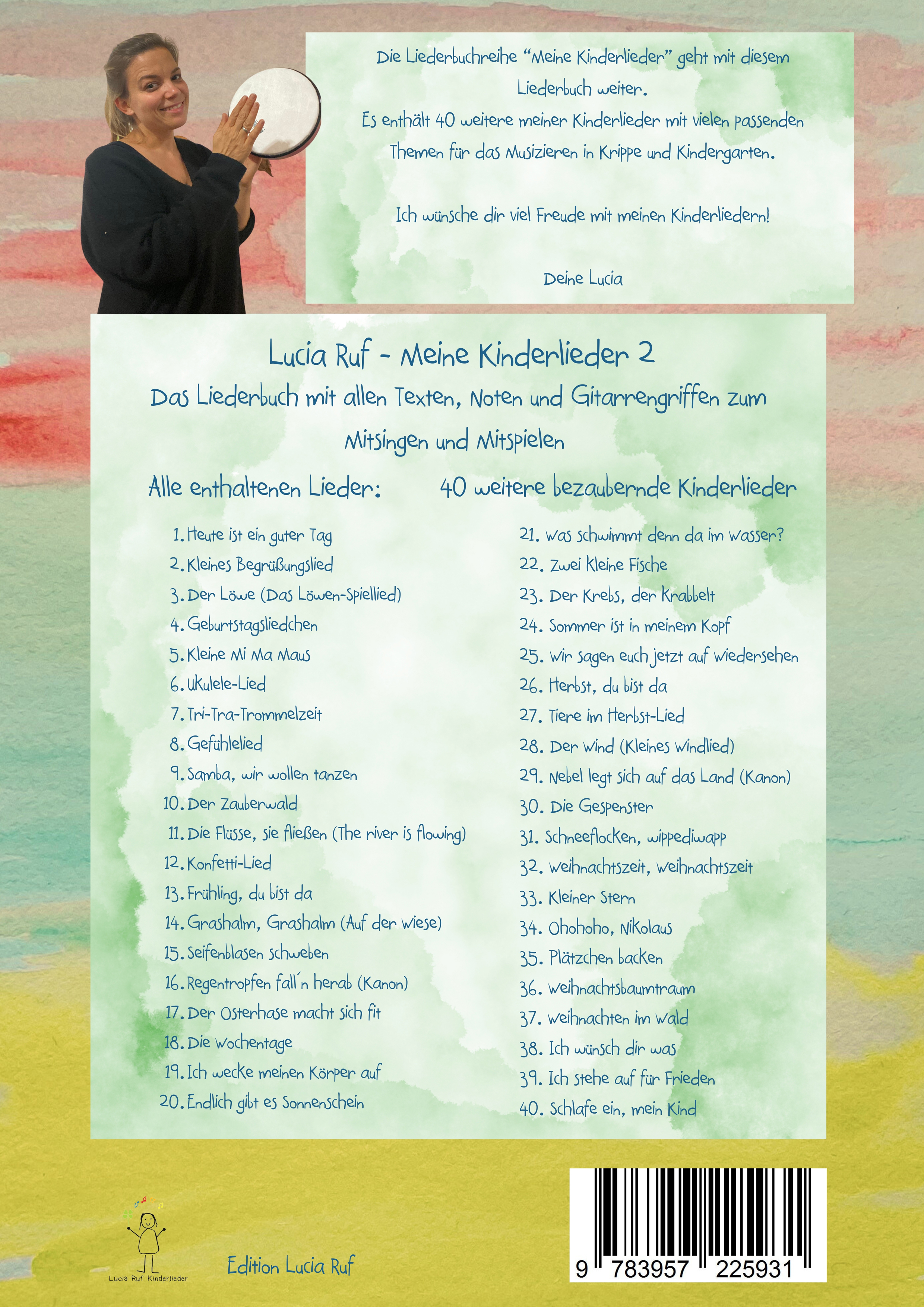 Lucia Ruf - Meine Kinderlieder 2 - 40 weitere bezaubernde neue Kinderlieder von und mit Lucia Ruf & Freund*innen.Das Liederbuch mit allen Texten, Noten und Gitarrengriffen zum Mitsingen und Mitspielen.Die Liederbuchreihe "Meine Kinderlieder" geht mit diesem Liederbuch weiter.Es enthält abermals 40 neue Kinderlieder mit vielen passenden Themen für das Muszieren in Krippe und Kindergarten. Meine Kinderlieder zeichnen sich durch einfache Texte und eingängige Melodien aus. Alle Lieder können spielend leicht eingesetzt werden und zur musikalischen sowie sprachlichen Entwicklung der Kinder beitragen. Gleichzeit stärken sie die soziale Interaktion. Also lasst uns gemeinsam kreativ sein und die Freude am Singen und Musizieren erleben.Deine Lucia.Alle enthaltenen Lieder:1. Heute ist ein guter Tag2. Kleines Begrüßungslied3. Der Löwe (Das Löwen-Spiellied)4. Geburtstagsliedchen5. Kleine Mi Ma Maus6. Ukulele-Lied7. Tri-Tra-Trommelzeit8. Gefühlelied9. Samba, wir wollen tanzen10. Der Zauberwald11. Die Flüsse, sie fließen (The river is flowing)12. Konfetti-Lied13. Frühling, du bist da14. Grashalm, Grashalm (Auf der Wiese)15. Seifenblasen schweben16. Regentropfen fall´n herab (Kanon)17. Der Osterhase macht sich fit18. Die Wochentage19. Ich wecke meinen Körper auf20. Endlich gibt es Sonnenschein21. Was schwimmt denn da im Wasser?22. Zwei kleine Fische23. Der Krebs, der krabbelt24. Sommer ist in meinem Kopf25. Wir sagen euch jetzt auf Wiedersehen26. Herbst, du bist da27. Tiere im Herbst-Lied28. Der Wind (Kleines Windlied)29. Nebel legt sich auf das Land (Kanon)30. Die Gespenster31. Schneeflocken, wippediwapp32. Weihnachtszeit, Weihnachtszeit33. Kleiner Stern34. Ohohoho, Nikolaus35. Plätzchen backen36. Weihnachtsbaumtraum37. Weihnachten im Wald38. Ich wünsch dir was39. Ich stehe auf für Frieden40. Schlafe ein, mein KindViel Freude beim Singen und Musizieren. Zu diesem Liederbuch sind separat Download/Streaming-Alben erschienen.