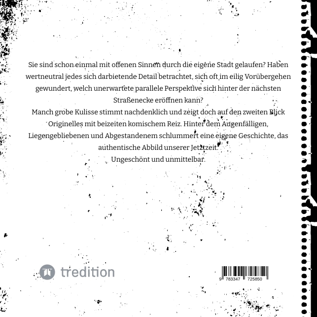 Sie sind schon einmal mit offenen Sinnen durch die eigene Stadt gelaufen? Haben wertneutral jedes sich darbietende Detail betrachtet, sich oft im eilig Vorübergehen gewundert, welch unerwartete parallele Perspektive sich hinter der nächsten Straßenecke eröffnen kann?Manch grobe Kulisse stimmt nachdenklich und zeigt doch auf dem zweiten Blick Originelles mit beizeiten komischem Reiz. Hinter dem Augenfälligen, Liegengebliebenen und Abgestandenem schlummert eine eigene Geschichte, das authentische Abbild unserer Jetztzeit. Ungeschönt, authentisch, unmittelbar.In Zeiten des rasenden globalen Wandels darf es erlaubt sein, nach der eigenen Identität zu forschen. Den Kennerblick anzuwenden und sich beim Umsehen in der unmittelbaren Umgebung zu fragen: Was macht sie eigentlich aus, die deutsche Gegenwart? Was ist deutsch?Auf eine neue, unverfälschte Blickrichtung verwiesen schon die Denker unserer gemeinsamen Vergangenheit. Irgendetwas ist dran am deutschen Wesen, am tief sinnenden Geist mit der manchmal groben Kulisse.