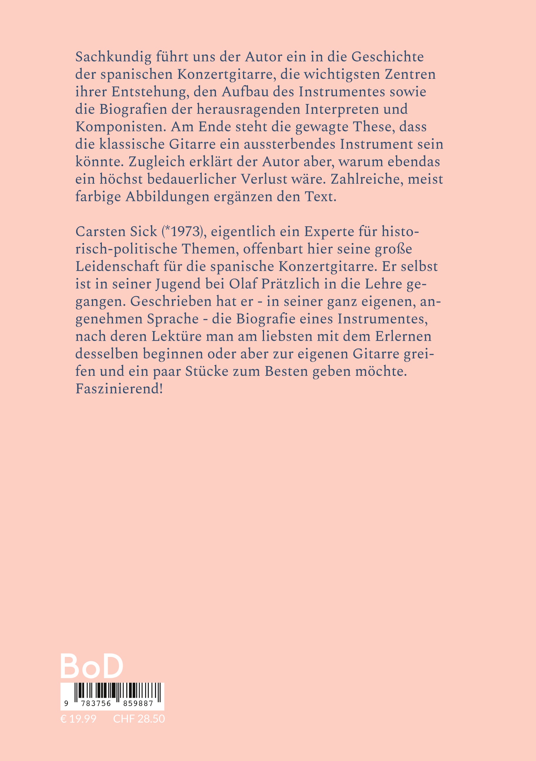 Sachkundig führt uns der Autor ein in die Geschichte der spanischen Konzertgitarre, die wichtigsten Zentren Ihrer Entstehung, den Aufbau des Instrumentes sowie die Biografien der herausragenden Interpreten und Komponisten. Am Ende des Buches steht die gewagte These, dass die klassische Gitarre ein aussterbendes Instrument sein könnte. Zugleich erklärt der Autor aber, warum ebendas ein höchst bedauerlicher Verlust wäre. Carsten Sick, eigentlich ein Experte für historisch-politische Themen, offenbart hier seine große Liebe für die spanische Konzertgitarre. Geschrieben hat er - in seiner ganz eigenen, angenehmen Sprache - die Biografie eines Instrumentes, nach deren Lektüre man am liebsten gleich zur eigenen Gitarre greifen und einige Stücke zum besten geben möchte. Faszinierend! Zahlreiche, meist farbige Abbildungen sowie hillfreiche Praxistipps ergänzen den Text.