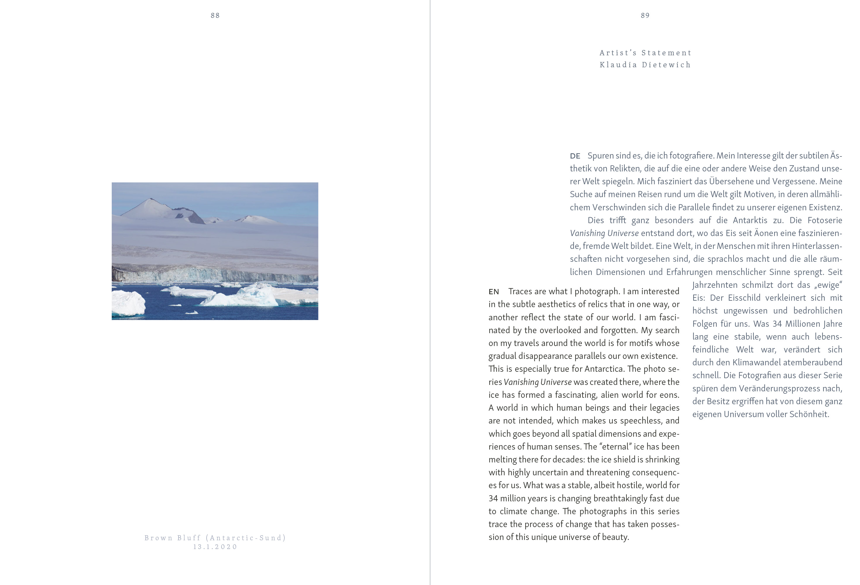 Die Fotoserie „Vanishing Universe“ entstand dort, wo das Eis seit Äonen eine faszinierende, fremde Welt bildet. Eine Welt, in der Menschen mit ihren Hinterlassenschaften nicht vorgesehen sind, die sprachlos macht und die alle räumlichen Dimensionen und Erfahrungen menschlicher Sinne sprengt.