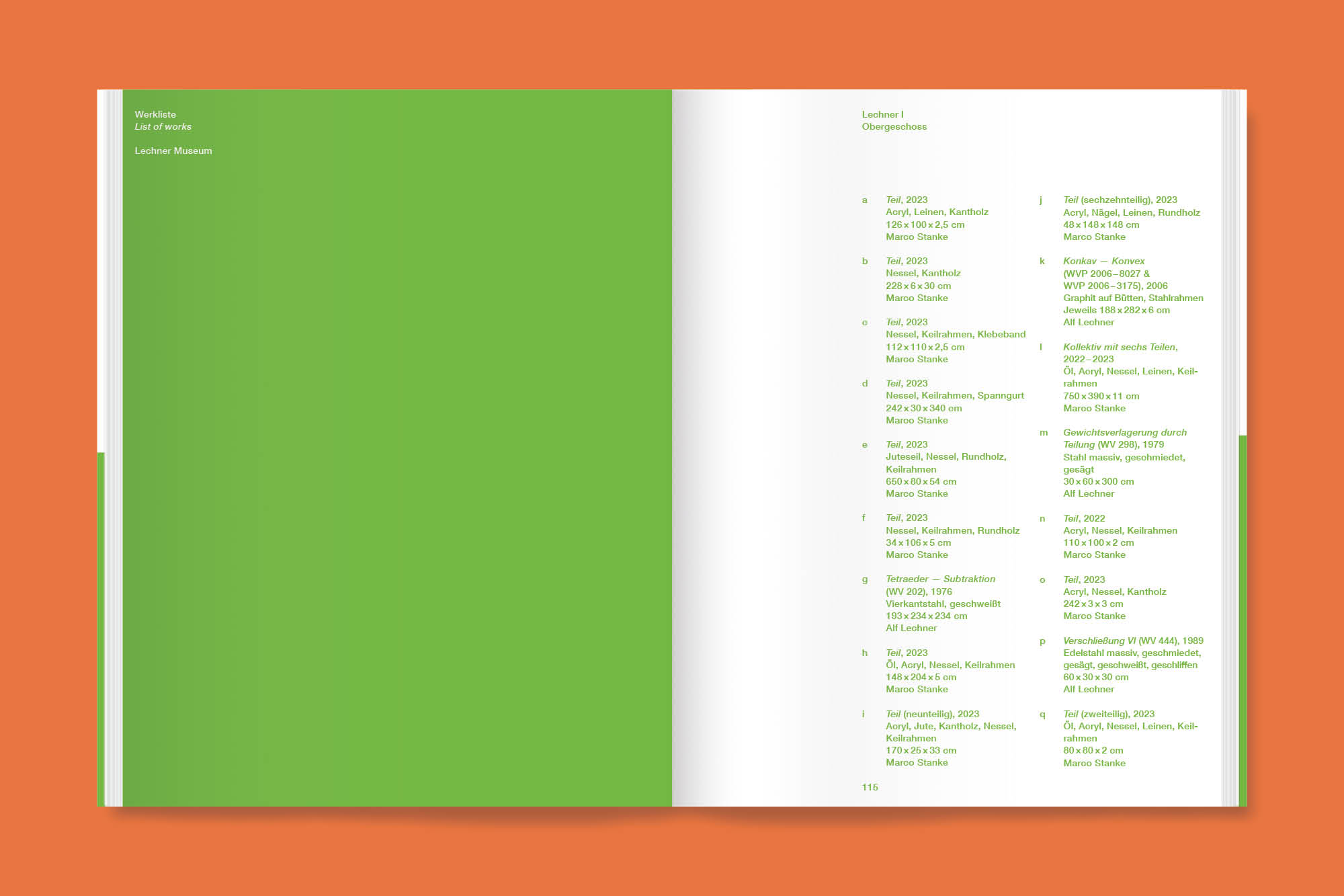 Marco Stanke (*1987) wurde 60 Jahre nach Alf Lechner (1925–2017) geboren. Trotzdem weisen ihre künstlerischen Positionen vielschichtige Bezüge auf. In Stankes Malereien ist die Leinwand nicht bloß ein Bildträger. Seine Arbeiten sind vielmehr räumliche Gebilde aus Nessel, Keilrahmen und Farbe. Stanke faltet, schneidet, biegt, stapelt und durchbohrt die Leinwände und erprobt die körperlichen Grenzen des Bildes, das er in den Raum ausdehnt. Seine Werke sind teils Bild, teils Relief oder Skulptur, und erst im Zusammenspiel dieser unterschiedlichen „Teile“, wie Stanke selbst sie nennt, ergibt sich am Ende das vollständige Bild.