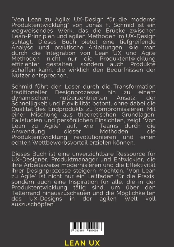 "Von Lean zu Agile: UX-Design für die moderne Produktentwicklung" von Jonas F. Schmid ist ein wegweisendes Werk, das die Brücke zwischen Lean-Prinzipien und agilen Methoden im UX-Design schlägt. Dieses Buch bietet eine tiefgreifende Analyse und praktische Anleitungen, wie man durch die Integration von Lean UX und Agile Methoden nicht nur die Produktentwicklung effizienter gestalten, sondern auch Produkte schaffen kann, die wirklich den Bedürfnissen der Nutzer entsprechen.Schmid führt den Leser durch die Transformation traditioneller Designprozesse hin zu einem dynamischen, nutzerzentrierten Ansatz, der Schnelligkeit und Flexibilität betont, ohne dabei die Qualität des Endprodukts zu kompromissieren. Mit einer Mischung aus theoretischen Grundlagen, Fallstudien und persönlichen Einsichten, zeigt "Von Lean zu Agile" auf, wie Teams durch die Anwendung dieser Methoden die Produktentwicklung revolutionieren und einen echten Wettbewerbsvorteil erzielen können.Dieses Buch ist eine unverzichtbare Ressource für UX-Designer, Produktmanager und Entwickler, die ihre Arbeitsweise modernisieren und die Effektivität ihrer Designprozesse steigern möchten. "Von Lean zu Agile" ist nicht nur ein Leitfaden für die Praxis, sondern auch eine Inspiration für alle, die in der Produktentwicklung tätig sind, um über den Tellerrand hinauszuschauen und die Möglichkeiten des UX-Designs in der agilen Welt voll auszuschöpfen.