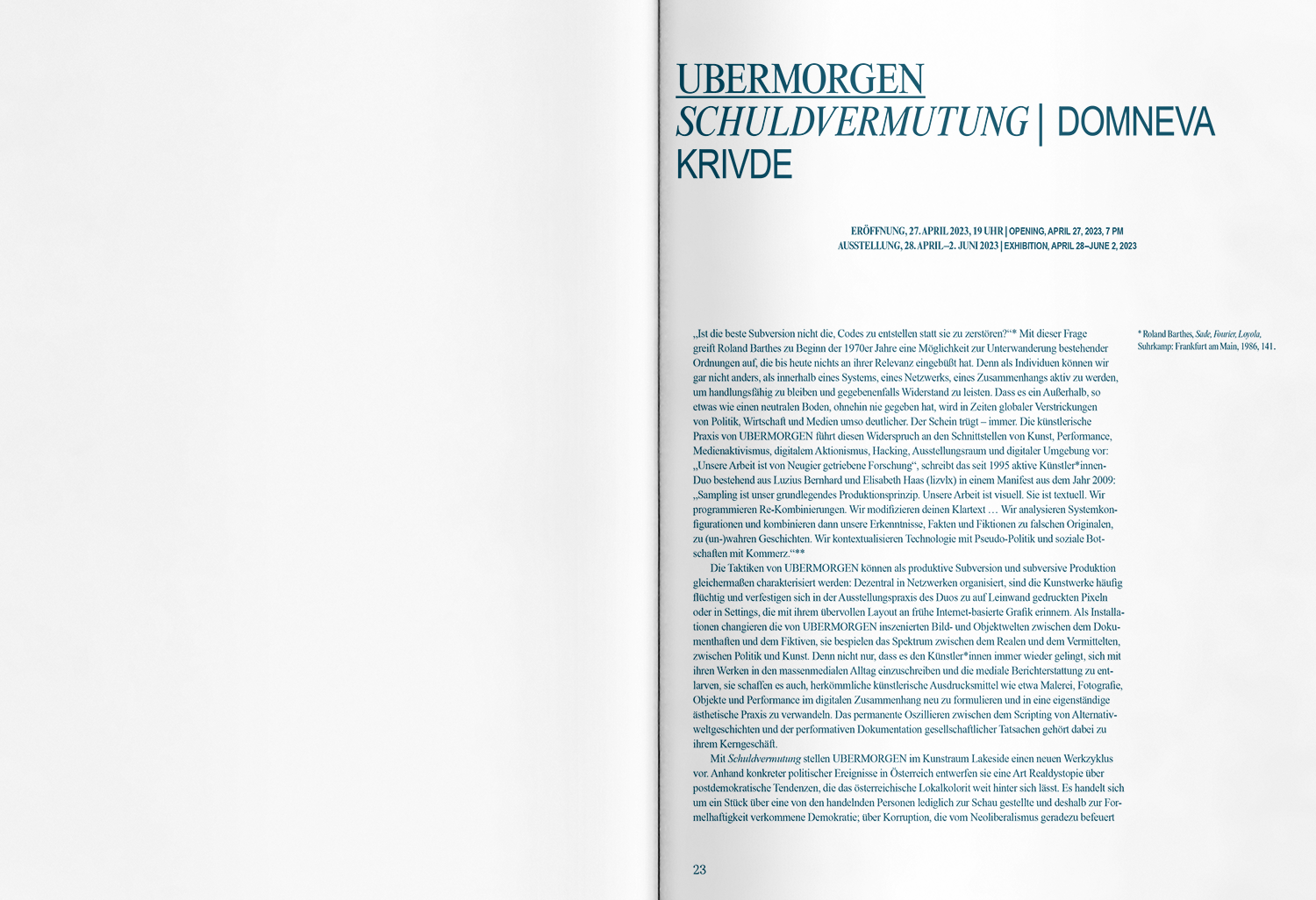 Ausgehend von einer seiner charakteristischsten architektonischen Voraussetzungen rückt der Kunstraum Lakeside mit der Jahrespublikation 2023 gegenwärtige Existenzmodelle in den Mittelpunkt des aktuellen Programms mit dem Titel "Doppelter Boden". Ebenso wie der tatsächliche Fußboden des Raums, einmal geöffnet, Einblick in die darunterliegende technische Infrastruktur gewährt, stellen Werke der eingeladenen Künstler*innen die grundlegenden Bedingungen heutiger Lebenswelten zur Schau. In "Doppelter Boden" geht es um wirklichkeitsherstellende Performances, die sowohl im analogen wie im digitalen Raum wirksam sind. Mit dem Jahresprogramm werden Fragen zu technologischen und/oder sozialen Skripts aufgeworfen, die die individuellen Lebenszusammenhänge im 21. Jahrhundert präfigurieren. Es geht nicht zuletzt auch um die Fragilität des menschlichen Körpers, um seine Verletzlichkeit. Mit Postern von Michail Michailov, UBERMORGEN, Robin Waart, Stephanie Misa, Barbara Kapusta.