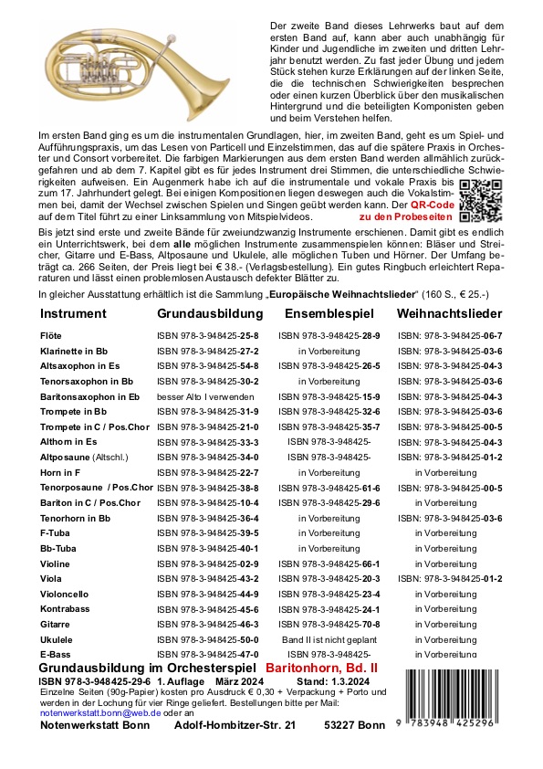 Bis jetzt sind erste und zweite Bände für zweiundzwanzig Instrumente erschienen. Nun gibt es endlich ein Unterrichtswerk, bei dem alle möglichen Instrumente zusammenspielen können: Bläser und Streicher, Gitarre und E-Bass, Altposaune und Ukulele, alle möglichen Tuben und Hörner. Der Umfang beträgt ca. 266 Seiten, der Preis liegt bei € 38.- (Verlagsbestellung). Ein gutes Ringbuch erleichtert Reparaturen und lässt einen problemlosen Austausch defekter Blätter zu.