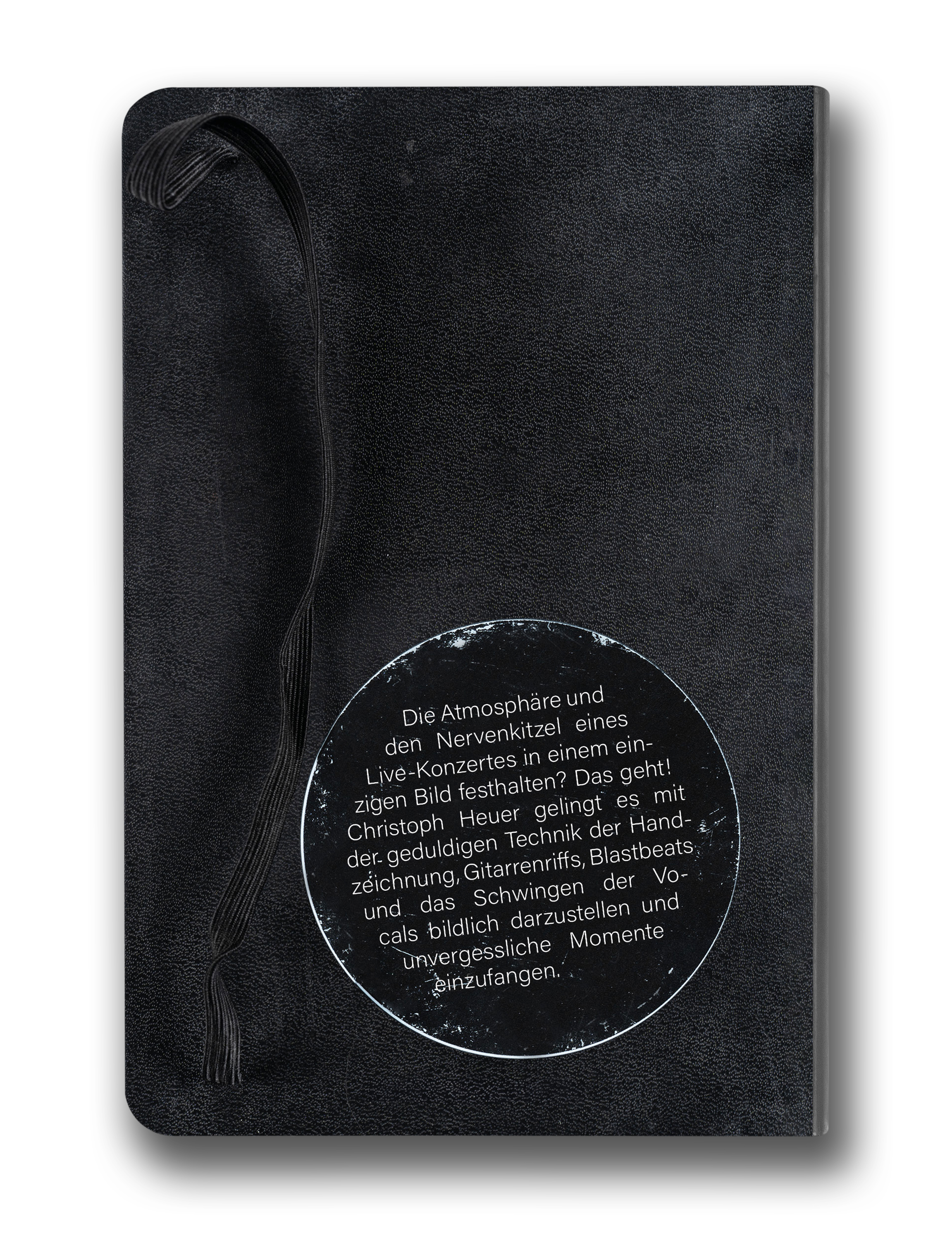 Die Atmosphäre und den Nervenkitzel eines Live-Konzertes in einem einzigen Bild festhalten? Das geht! Christoph Heuer gelingt es mit der geduldigen Technik der Handzeichnung, Gitarrenriffs, Blastbeats und das Schwingen der Vocals bildlich darzustellen und unvergessliche Momente einzufangen. Im Skizzenbuch sind unter anderem Musiker bekannter Bands wie Sepultura, The Haunted, Hatebreed, Saltatio Mortis, Flotsam and Jetsam, Devildriver, Prong und nicht zuletzt Billy Gibbons von ZZ Top abgebildet. Zudem finden sich eindrückliche Zeichnungen großer Festivals wie dem Duisburger Rage against racism, dem Nord Open Air in Essen und dem allseits bekannten „Festival der Festivals“ in Wacken.