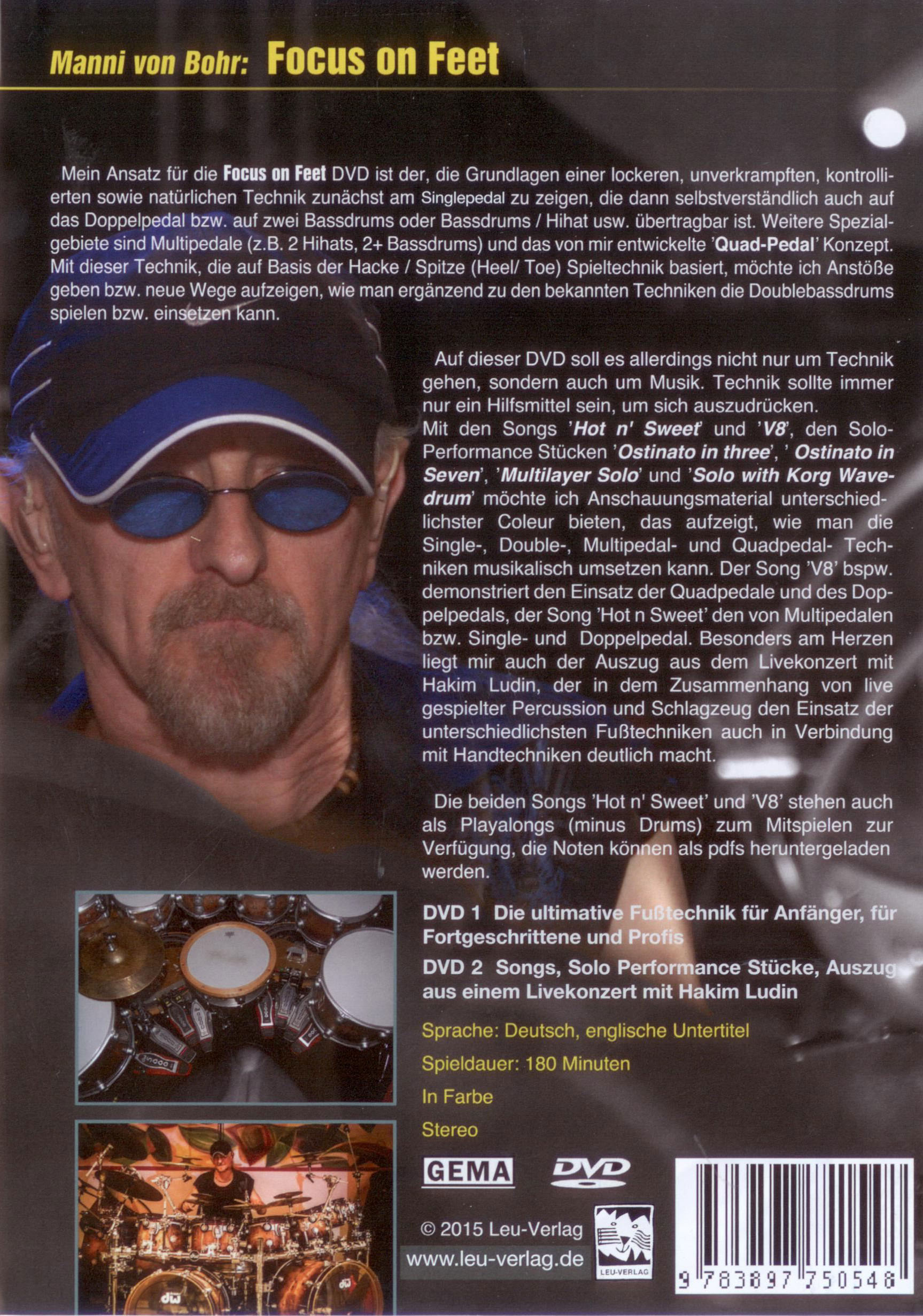 Manni von Bohr zeigt die Grundlagen einer lockeren, unverkrampften, kontrollierten sowie natürlichen Technik zunächst am Singlepedal, die dann selbstverständlich auch auf das Doppelpedal bzw. auf zwei Bassdrums / Hihat usw. übertragbar ist. Weitere Spezialgebiete sind Multipedale (z.B. 2 Hihats, 2+Bassdrums) und das vom Autor entwickelte Quad-Pedal Konzept. Mit dieser Technik, die auf Basis der Hacke / Spitze (Heel Toe) Spieltechnik basiert, zeigt er neue Wege auf, wie man ergänzend zu den bekannten Techniken die Doublebassdrums spielen und einsetzen kann.