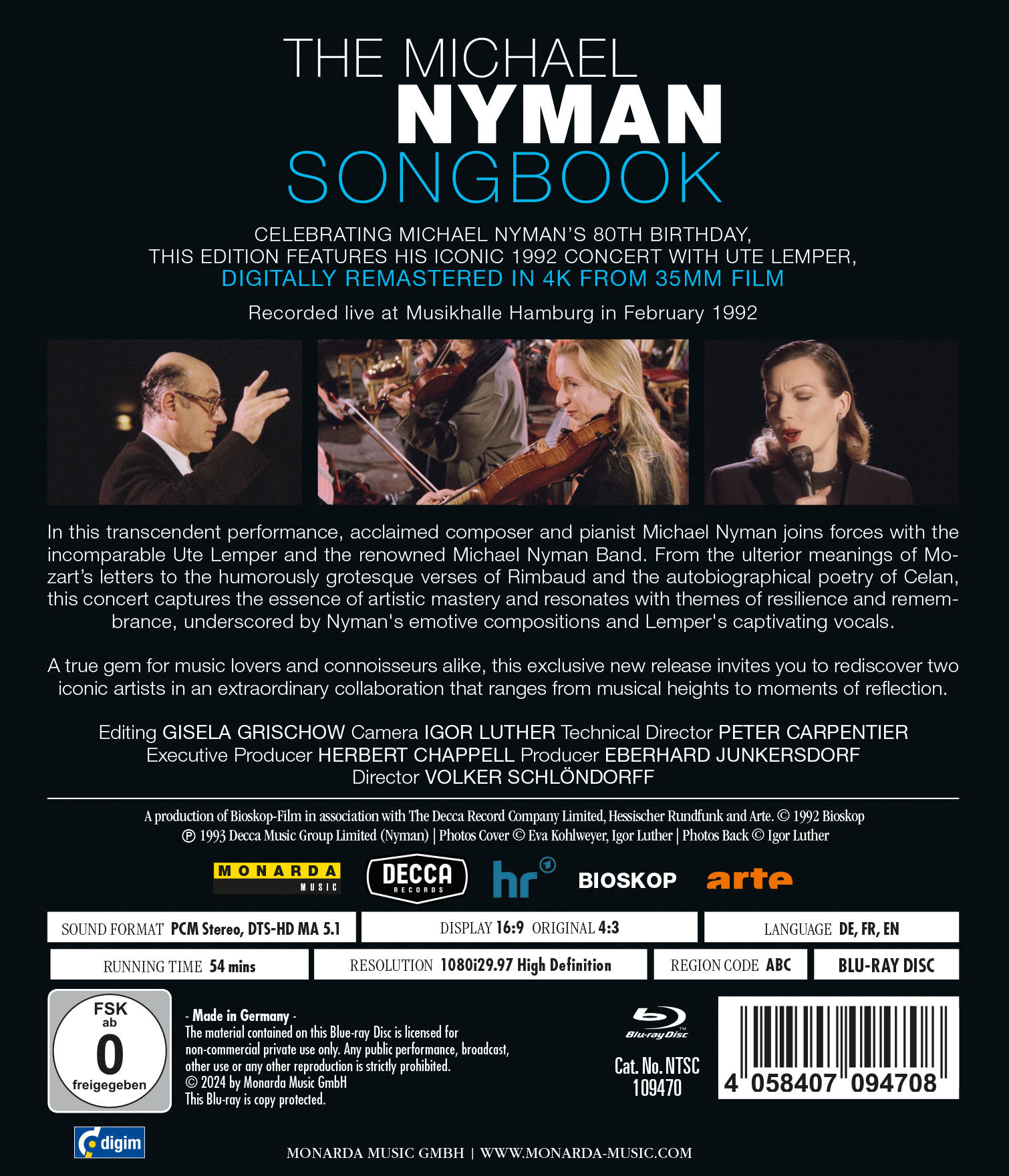 Erstmals restauriert, erscheint dieser 1992 auf 35mm Film gedrehte Konzertklassiker in HD-Qualität und ist damit ein wahres Juwel für alle Liebhaber und Kenner von Nymans Musik. Begleitet von Michael Nyman und seiner erstklassigen Band verleiht Weltstar Ute Lemper expressionistisch und virtuos den Kompositionen des Musikgenies ihre Stimme Ein Film von Oscar-Gewinner Volker Schlöndorff Im Februar 1992 live in der Musikhalle Hamburg aufgezeichnet Komponist und Dirigent: MICHAEL NYMAN Gesang: UTE LEMPER Musik: THE MICHAEL NYMAN BAND Produzent: EBERHARD JUNKERSDORF Regisseur: VOLKER SCHLÖNDORFF Texte von: W.A. MOZART, ARTHUR RIMBAUD, PAUL CELAN Ein unvergessliches Musikerlebnis: Der Komponist und Pianist Michael Nyman, die Virtuosin Ute Lemper und die Michael Nyman Band hauchen den verborgenen Botschaften in Mozarts Briefen, den grotesk-karikaturistischen Versen Rimbauds und den vom Holocaust geprägten autobiografischen Gedichten Celans neues Leben ein. Tauchen Sie ein in Nymans ergreifende Kompositionen und lassen Sie sich von Ute Lempers Gesang mitreißen. Dieser Konzertfilm von musikalischer Finesse lädt Sie ein, den Geschichten von Widerstand und Hoffnung in der einzigartigen Interpretation zweier Weltstars zu lauschen und mit ihnen sowohl musikalische Höhenflüge als auch Momente tiefer Besinnung zu teilen.