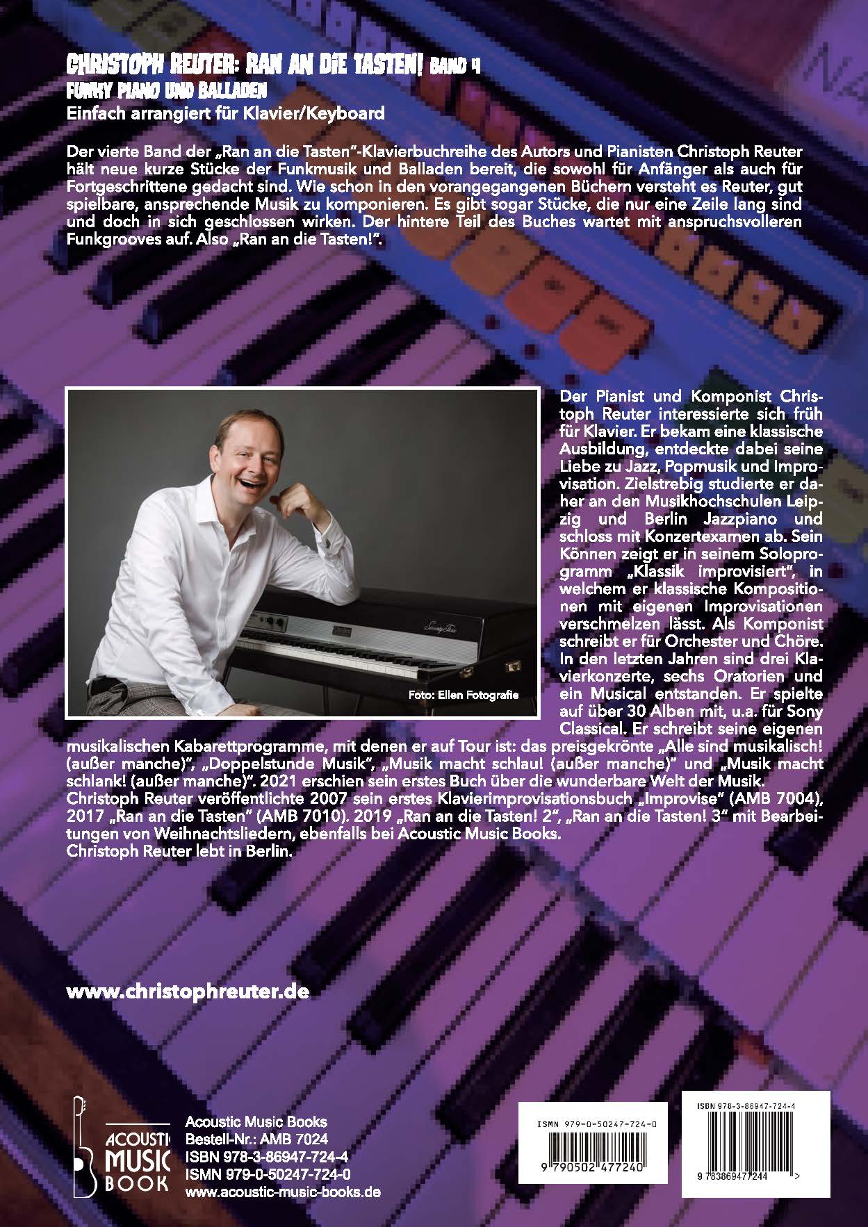 Neue, groovige Funkmusik und entspannten Balladen für Anfänger am Klavier/Keyboard stellt Komponist und Pianist Christoph Reuter im 4. Band der Reihe "Ran an die Tasten" vor. Auch diejenigen, die schon einige Zeit Klavier spielen, bekommen neue Anregungen. „Funk“ ist im traditionellen Klavierunterricht selten zu finden. Mit den kurzen Grooves wird der Unterricht populär angereichert und das Rhythmusgefühl der Schülerinnen und Schüler enorm verbessert. Die Balladen bilden bewußt einen deutlichen Kontrast und sorgen für Entspannung und stärken das melodische Empfinden.