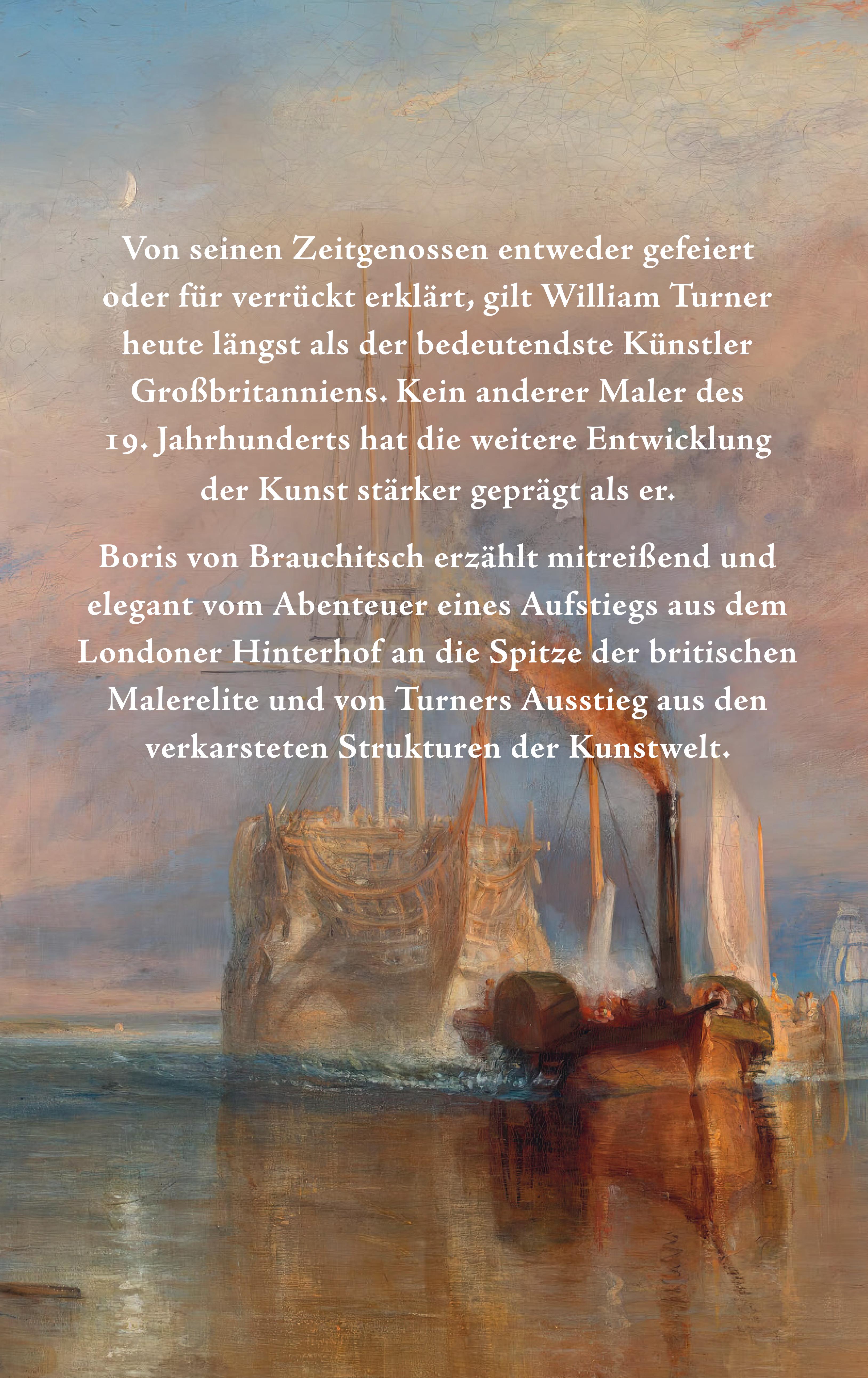William Turner (1775-1851), Sohn eines Barbiers, verfolgte seinen Traum von Anerkennung und Wohlstand erfolgreich mit den Mitteln der Kunst. Wohl keiner reiste und zeichnete so viel wie er, bediente einerseits gekonnt den Kunstmarkt und schuf zugleich Werke, von denen der Autor und Sammler William Beckford sagte, Turner »malt, als ob sein Hirn und seine Fantasie auf der Palette mit Seifenlauge und Schaum vermischt wären.«