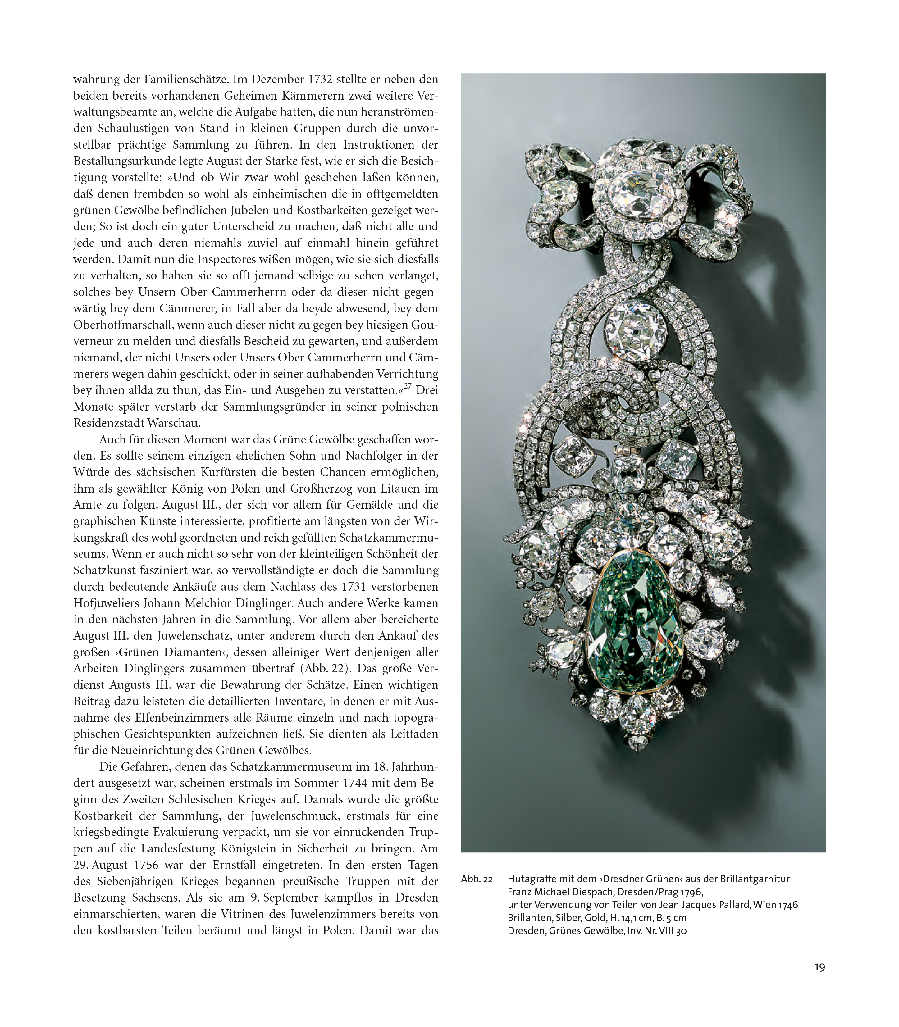 Mit dem Ausbau seines Staatstresors der „Geheimen Verwahrung" im Westflügel des Dresdner Residenzschlosses schuf sich August der Starke, Kurfürst von Sachsen und König von Polen, in den Jahren 1723 bis 1729 ein Schatzkunstmuseum, das damals wie heute seinesgleichen sucht. Die acht Schauräume sollten die Besucher durch ihre erlesene Ausstattung und die höchst eindrucksvolle Inszenierung der Sammlung in Staunen versetzen. Die verschwenderische Fülle der Kostbarkeiten aus Gold, Silber, Email und Edelsteinen, die Elfenbeinkunstwerke, Bronzen und Juwelen kündeten von Wohlstand und Kunstsinn des sächsischen Fürstenhauses. Nach der kriegsbedingten Schließung des Museums 1942 präsentieren sich die Schätze seit 2006 wieder in dem eigens für sie geschaffenen Ambiente. Auch heute dürfte die perfekte Symbiose aufwendiger Innenarchitektur mit einer ebenso vielfältigen wie qualitätvollen Kollektion kaum ihre Wirkung verfehlen. Der Band stellt die Meisterwerke dieser faszinierenden Sammlung vor und gibt Einblicke in das geniale Konzept des Museumsgründers, an dem sich die heutige Präsentation orientiert. Ein barockes Gesamtkunstwerk Eine visuelle Zeitreise in den Barock Blick ins Buch