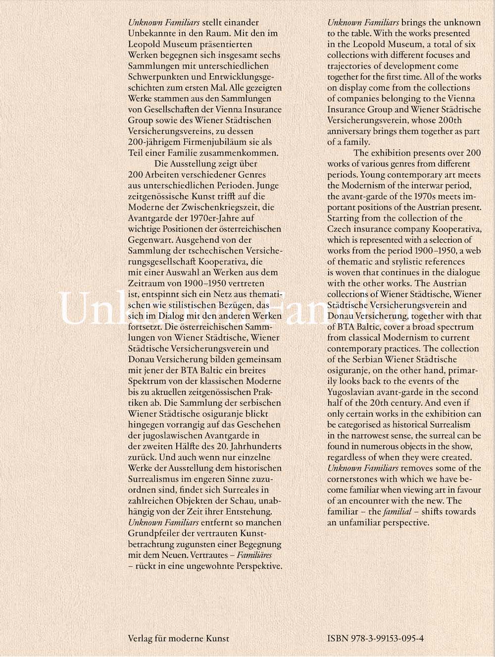 Unknown Familiars stellt einander Unbekannte in den Raum. Mit den im Leopold Museum in Wien präsentierten Werken begegnen sich insgesamt sechs Sammlungen mit unterschiedlichen Schwerpunkten und Entwicklungsgeschichten zum ersten Mal. Alle gezeigten Werke stammen aus den Sammlungen von Gesellschaften der Vienna Insurance Group sowie des Wiener Städtischen Versicherungsvereins, zu dessen 200-jährigem Firmenjubiläum sie als Teil einer Familie zusammenkommen.Die Ausstellung zeigt über 200 Arbeiten verschiedener Genres aus unterschiedlichen Perioden. Junge zeitgenössische Kunst trifft auf die Moderne der Zwischenkriegszeit, die Avantgarde der 1970er-Jahre auf wichtige Positionen der österreichischen Gegenwart. Ausgehend von der Sammlung der tschechischen Versicherungsgesellschaft Kooperativa, die mit einer Auswahl an Werken aus dem Zeitraum von 1900-1950 vertreten ist, entspinnt sich ein Netz aus thematischen wie stilistischen Bezügen, das sich im Dialog mit den anderen Werken fortsetzt. Die österreichischen Sammlungen von Wiener Städtische, Wiener Städtische Versicherungsverein und Donau Versicherung bilden gemeinsam mit jener der BTA Baltic ein breites Spektrum von der klassischen Moderne bis zu aktuellen zeitgenössischen Praktiken ab. Die Sammlung der serbischen Wiener Städtische osiguranje blickt hingegen vorrangig auf das Geschehen der jugoslawischen Avantgarde in der zweiten Hälfte des 20. Jahrhunderts zurück. Und auch wenn nur einzelne Werke der Ausstellung dem historischen Surrealismus im engeren Sinne zuzuordnen sind, findet sich Surreales in zahlreichen Objekten der Schau, unabhängig von der Zeit ihrer Entstehung.Unknown Familiars entfernt so manchen Grundpfeiler der vertrauten Kunstbetrachtung zugunsten einer Begegnung mit dem Neuen. Vertrautes - Familiäres - rückt in eine ungewohnte Perspektive.