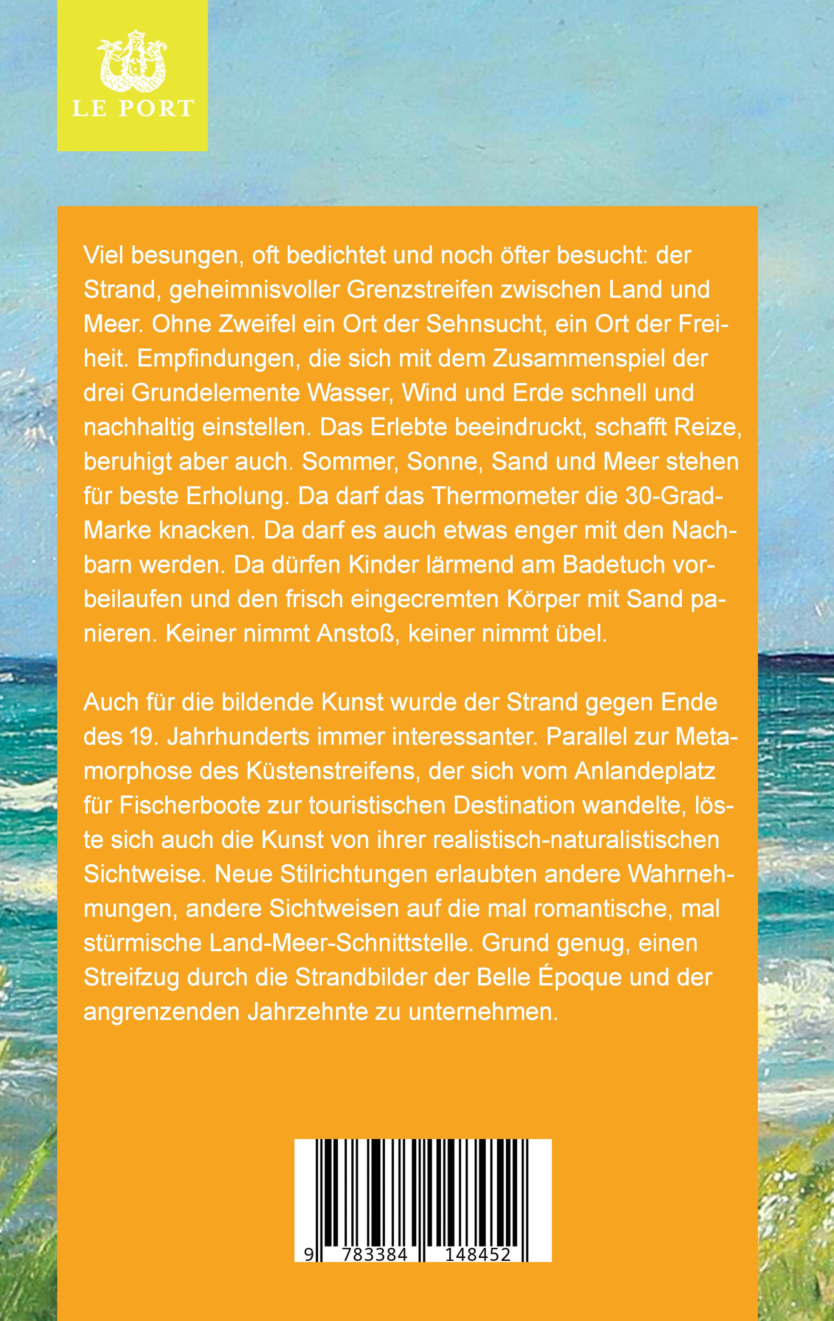 Viel besungen, oft bedichtet und noch öfter besucht: der Strand, geheimnisvoller Grenzstreifen zwischen Land und Meer. Ohne Zweifel ein Ort der Sehnsucht, ein Ort der Freiheit. Empfindungen, die sich mit den drei Grundelementen Wasser, Wind und Erde und ihrem Zusammenspiel schnell einstellen.Auch für die bildende Kunst wurde der Strand gegen Ende des 19. Jahrhunderts immer interessanter. Parallel zur Metamorphose des Küstenstreifens, der sich vom Anlandeplatz für Fischerboote zur touristischen Destination wandelte, löste sich auch die Kunst von ihrer realistisch-naturalistischen Sichtweise. Neue Stilrichtungen erlaubten andere Wahrnehmungen, andere Sichtweisen auf die mal romantische, mal stürmische Land-Meer-Schnittstelle. Grund genug, einen Streifzug durch die Strandbilder der Belle Époque und der angrenzenden Jahrzehnte zu unternehmen. Vierzehn Bilder wurden ausgewählt, vierzehn Geschichten aufgeschrieben. Oft von den Künstlern selbst, den Zeitumständen, der Stilistik, der Maltechnik oder von ungewöhnlichen Motiven auf dem Silbertablett serviert. Bisweilen aber auch aus dem Reich der Phantasie entführt.