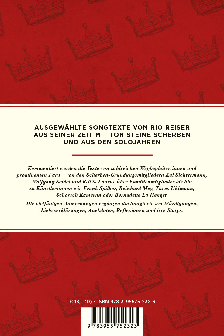 Die Faszination für seine zeitlosen Texte und Lieder ist ungebrochen, wie sich an der anhaltenden Rezeption in Dokumentationen, Podcasts und Ausstellungen zeigt. So ist es kaum zu glauben, dass es bisher noch keinen karriereübergreifenden Band mit den Texten Reisers gab - eine Lücke, die nun endlich geschlossen wird. »Ich will ich sein« enthält über 100 Songtexte, sowohl aus seiner Zeit mit Ton Steine Scherben als auch den Solojahren.