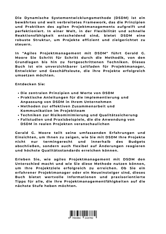 Die Dynamische Systementwicklungsmethode (DSDM) ist ein bewährtes und weit verbreitetes Framework, das die Prinzipien und Praktiken des agilen Projektmanagements aufgreift und perfektioniert. In einer Welt, in der Flexibilität und schnelle Reaktionsfähigkeit entscheidend sind, bietet DSDM eine robuste Struktur, um Projekte effizient und zielgerichtet zu steuern.In "Agiles Projektmanagement mit DSDM" führt Gerald G. Moore Sie Schritt für Schritt durch die Methodik, von den Grundlagen bis hin zu fortgeschrittenen Techniken. Dieses Buch ist ein unverzichtbarer Leitfaden für Projektmanager, Entwickler und Geschäftsleute, die ihre Projekte erfolgreich umsetzen möchten.Entdecken Sie:Die zentralen Prinzipien und Werte von DSDMPraktische Anleitungen für die Implementierung und Anpassung von DSDM in Ihrem UnternehmenMethoden zur effektiven Zusammenarbeit und Kommunikation im ProjektteamTechniken zur Risikominimierung und QualitätssicherungFallstudien und Praxisbeispiele, die die Anwendung von DSDM in realen Projekten veranschaulichenGerald G. Moore teilt seine umfassenden Erfahrungen und Einsichten, um Ihnen zu zeigen, wie Sie mit DSDM Ihre Projekte nicht nur termingerecht und innerhalb des Budgets abschließen, sondern auch flexibel auf Änderungen reagieren und höchste Qualitätsstandards erreichen können.Erleben Sie, wie agiles Projektmanagement mit DSDM den Unterschied macht und wie Sie diese Methode nutzen können, um Ihre Projektziele erfolgreich zu erreichen. Ob Sie ein erfahrener Projektmanager oder ein Neueinsteiger sind, dieses Buch bietet wertvolle Informationen und praxisorientierte Tipps für alle, die ihre Projektmanagementfähigkeiten auf die nächste Stufe heben möchten.
