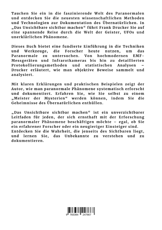 Tauchen Sie ein in die faszinierende Welt des Paranormalen und entdecken Sie die neuesten wissenschaftlichen Methoden und Technologien zur Dokumentation des Übernatürlichen. In "Das Unsichtbare sichtbar machen" führt Frank Drucker Sie auf eine spannende Reise durch die Welt der Geister, UFOs und unerklärlichen Phänomene.Dieses Buch bietet eine fundierte Einführung in die Techniken und Werkzeuge, die Forscher heute nutzen, um das Paranormale zu untersuchen. Von hochmodernen EMF-Messgeräten und Infrarotkameras bis hin zu detaillierten Protokollierungsmethoden und statistischen Analysen - Drucker erläutert, wie man objektive Beweise sammelt und analysiert.Mit klaren Erklärungen und praktischen Beispielen zeigt der Autor, wie man paranormale Phänomene systematisch erforscht und dokumentiert. Erfahren Sie, wie Sie selbst zu einem "Meister der Mysterien" werden können, indem Sie die Geheimnisse des Übernatürlichen enthüllen."Das Unsichtbare sichtbar machen" ist ein unverzichtbarer Leitfaden für jeden, der sich ernsthaft mit der Erforschung paranormaler Phänomene beschäftigen möchte - egal, ob Sie ein erfahrener Forscher oder ein neugieriger Einsteiger sind.Entdecken Sie die Wahrheit, die jenseits des Sichtbaren liegt, und lernen Sie, das Unbekannte zu verstehen und zu dokumentieren.