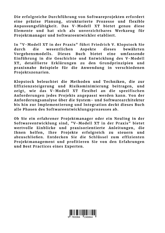 Die erfolgreiche Durchführung von Softwareprojekten erfordert eine präzise Planung, strukturierte Prozesse und flexible Anpassungsfähigkeit. Das V-Modell XT bietet genau diese Elemente und hat sich als unverzichtbares Werkzeug für Projektmanager und Softwareentwickler etabliert.In "V-Modell XT in der Praxis" führt Friedrich V. Klopstock Sie durch die wesentlichen Aspekte dieses bewährten Vorgehensmodells. Dieses Buch bietet eine umfassende Einführung in die Geschichte und Entwicklung des V-Modell XT, detaillierte Erklärungen zu den Grundprinzipien und praxisnahe Beispiele für die Anwendung in verschiedenen Projektszenarien.Klopstock beleuchtet die Methoden und Techniken, die zur Effizienzsteigerung und Risikominimierung beitragen, und zeigt, wie das V-Modell XT flexibel an die spezifischen Anforderungen jedes Projekts angepasst werden kann. Von der Anforderungsanalyse über die System- und Softwarearchitektur bis hin zur Implementierung und Integration deckt dieses Buch alle Phasen des Softwareentwicklungsprozesses ab.Ob Sie ein erfahrener Projektmanager oder ein Neuling in der Softwareentwicklung sind, "V-Modell XT in der Praxis" bietet wertvolle Einblicke und praxisorientierte Anleitungen, die Ihnen helfen, Ihre Projekte erfolgreich zu steuern und abzuschließen. Entdecken Sie die Schlüssel zum effizienten Projektmanagement und profitieren Sie von den Erfahrungen und Best Practices eines Experten.