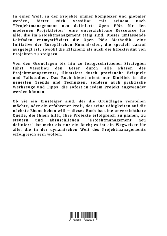 In einer Welt, in der Projekte immer komplexer und globaler werden, bietet Nick Vassiliou mit seinem Buch "Projektmanagement neu definiert: Open PM2 für den modernen Projektleiter" eine unverzichtbare Ressource für alle, die im Projektmanagement tätig sind. Dieser umfassende Leitfaden entmystifiziert die Open PM2 Methodik, eine Initiative der Europäischen Kommission, die speziell darauf ausgelegt ist, sowohl die Effizienz als auch die Effektivität von Projekten zu steigern.Von den Grundlagen bis hin zu fortgeschrittenen Strategien führt Vassiliou den Leser durch alle Phasen des Projektmanagements, illustriert durch praxisnahe Beispiele und Fallstudien. Das Buch bietet nicht nur Einblick in die neuesten Trends und Techniken, sondern auch praktische Werkzeuge und Tipps, die sofort in jedem Projekt angewendet werden können.Ob Sie ein Einsteiger sind, der die Grundlagen verstehen möchte, oder ein erfahrener Profi, der seine Fähigkeiten auf die nächste Ebene heben will - dieses Buch ist eine unverzichtbare Quelle, die Ihnen hilft, Ihre Projekte erfolgreich zu planen, zu steuern und abzuschließen. "Projektmanagement neu definiert" ist mehr als nur ein Buch; es ist ein Wegweiser für alle, die in der dynamischen Welt des Projektmanagements erfolgreich sein wollen.