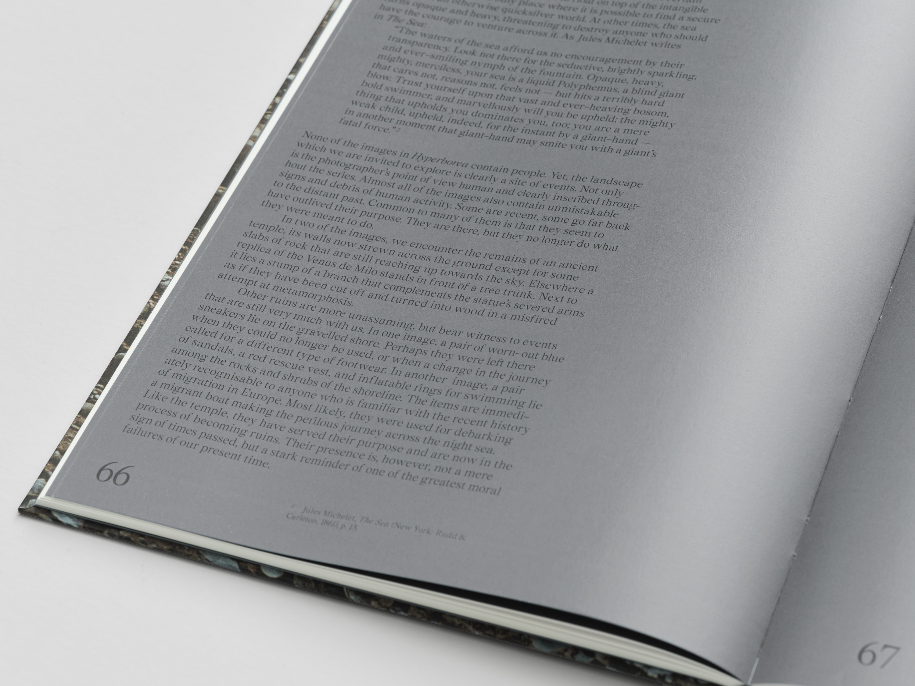 ""... In der griechischen Mythologie wird "Hyperborea" als ein weit entferntes Paradies auf Erden beschrieben, das für gewöhnliche Sterbliche unerreichbar ist. Die alten Griechen glaubten, dass nur übermenschliche Helden das Land des Überflusses jenseits des Nordwinds erreichen konnten. Wie hat sich unsere Weltanschauung seit damals doch gewandelt! Die Vorstellung von einem in Hülle und Fülle lebenden Norden gibt es noch immer, aber diejenigen, die sich dorthin aufmachen, werden nicht als heroisch wahrgenommen. ...""... Die Fotografien von Kai Werner Schmidt bringen Vertreibung und Entwurzelung auf eine Art und Weise zum Ausdruck, die von uns verlangt, über unseren Tellerrand hinauszublicken. Statt die Migranten in den Mittelpunkt zu stellen, lädt uns der Autor mit seinen Aufnahmen dazu ein, alles aus ihrem Blickwinkel zu betrachten. In Hyperborea offenbart sich uns eine alternative Sichtweise, die aktuellere Vorstellungen von "Wohnort" und "Umsiedlung" mit der Landschaft verbindet und von uns verlangt, unser traditionelles Ortsgefühl neu zu bewerten. Kein Bild dieser Fotoreihe zeigt Menschen, die an steinigen Küsten an Land gehen. Stattdessen dürfen wir uns zumindest vorstellen, wie es sein muss, eine kontroverse Landschaft zu durchqueren, in der allein schon unsere Anwesenheit umstritten ist. ..."