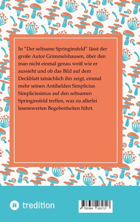 In "Der seltsame Springinsfeld" von Hans Jakob Christoffel von Grimmelshausen trifft der berühmte Simplicius Simplicissimus auf den titelgebenden Springinsfeld. Gemeinsam erleben und bereden sie so allerlei in und über die damalige Welt. Über den Autor ist wenig bekannt; es ist nicht einmal sicher, dass das Bild auf dem Deckblatt wirklich ihn zeigt. Die Forschung geht jedoch allgemein davon aus.